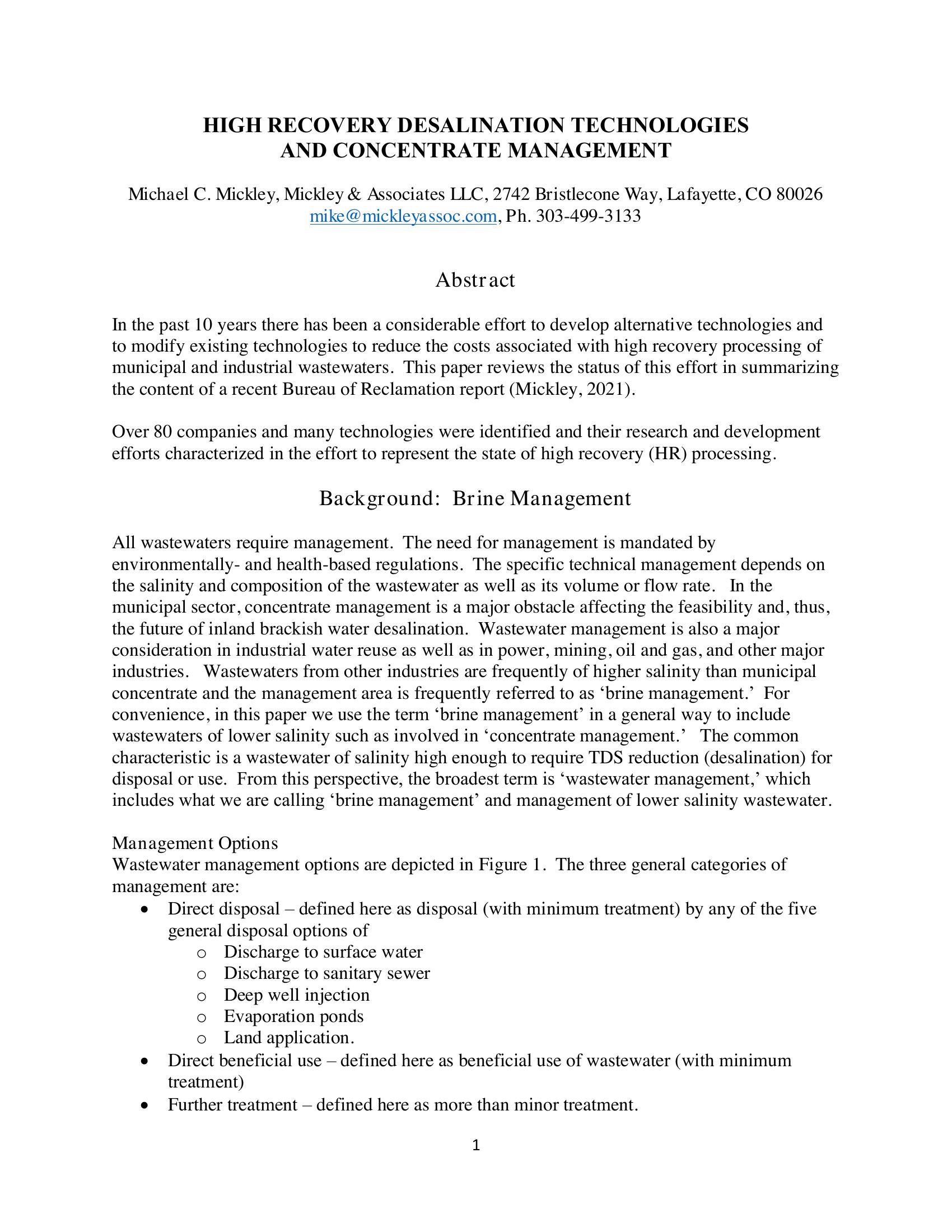 In the past 10 years there has been a considerable effort to develop alternative technologies and to modify existing technologies to reduce the costs associated with high recovery processing of municipal and industrial wastewaters. This paper reviews the status of this effort in summarizing the content of a recent Bureau of Reclamation report (Mickley, 2021). Over 80 companies and many technologies were identified and their research and development efforts characterized in the effort to represent the state of high recovery (HR) processing.
