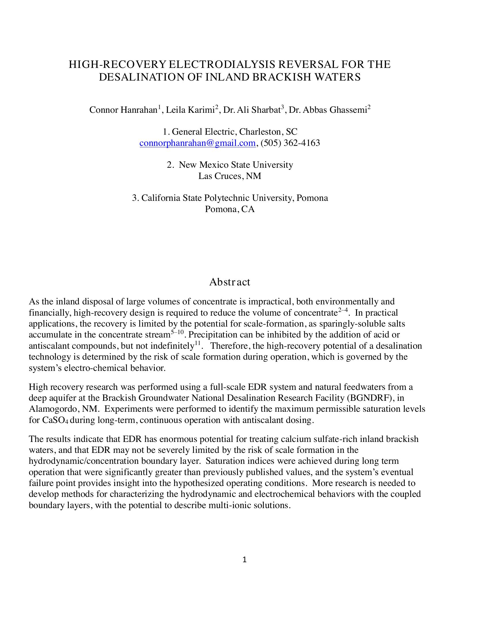 Due to prohibitively high cost of inland desalination, there has been a surge of interest into emerging technologies and techniques for recovery enhancement and concentration minimization. EDR has been identified for its potential as a high-recovery desalination technology. This research hypothesis was that EDR could effectively treat brackish groundwaters with high calium sulfate concentration, demonstrating its high-recovery potential for inland brackish water desalination. The full-scale EDR system demonstrated an ability to safely and efficiently treat a feedwater that was nearly saturated with calcium sulfate.