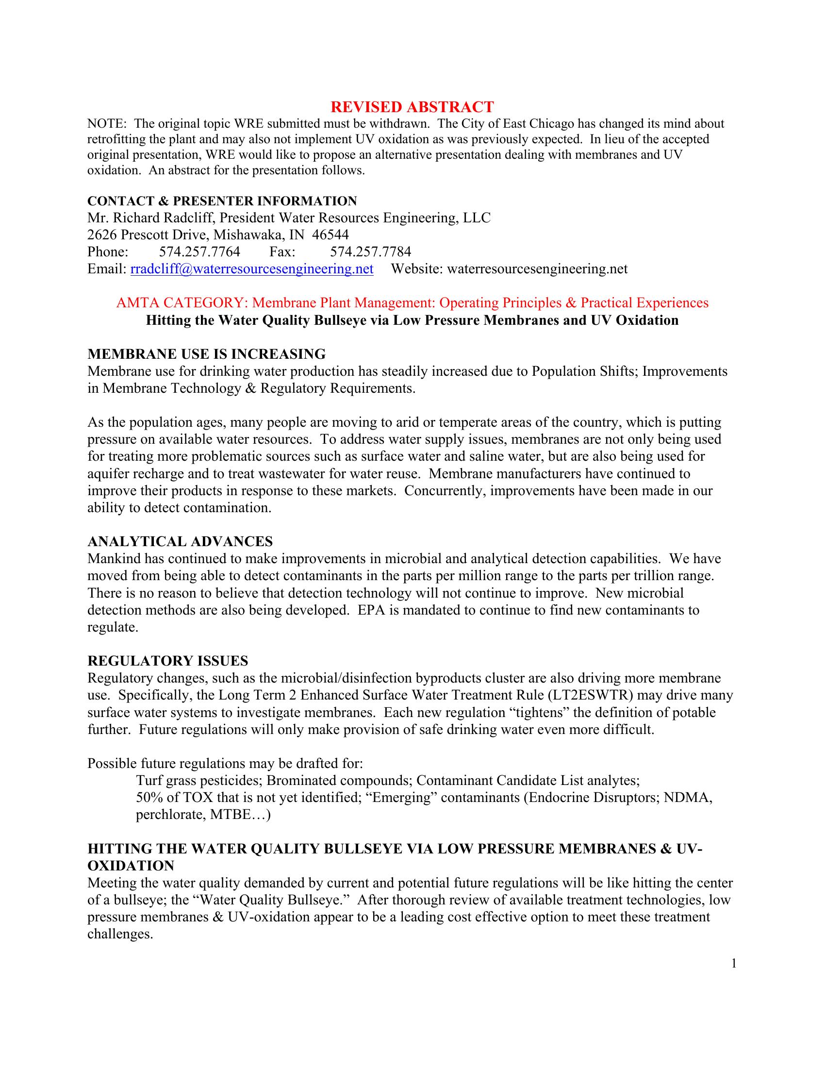 This paper will focus on the reasons why membrane use is growing, and will describe how membranes, coupled with UV oxidation, can be used to meet current Safe Drinking Water Act (SDWA) regulations as well as potential future regulations.
