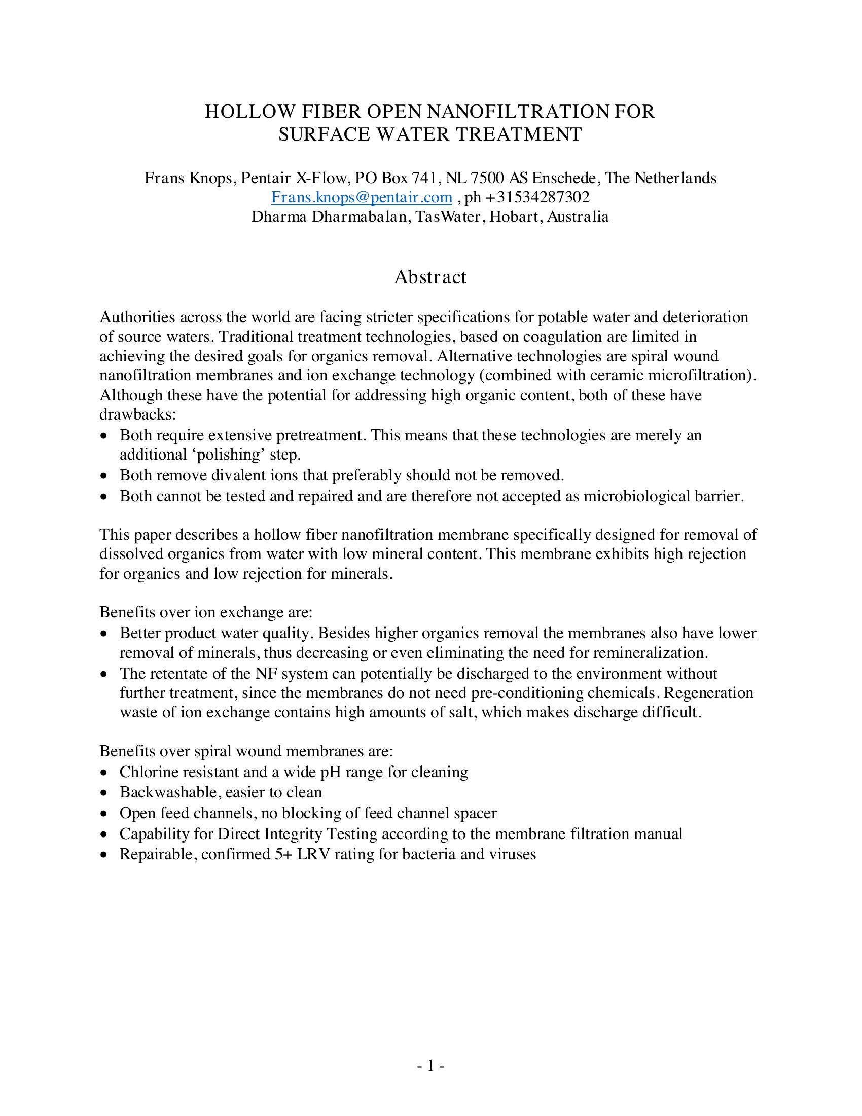 Hollow Fiber Open Nanofiltration for Surface Water Treatment