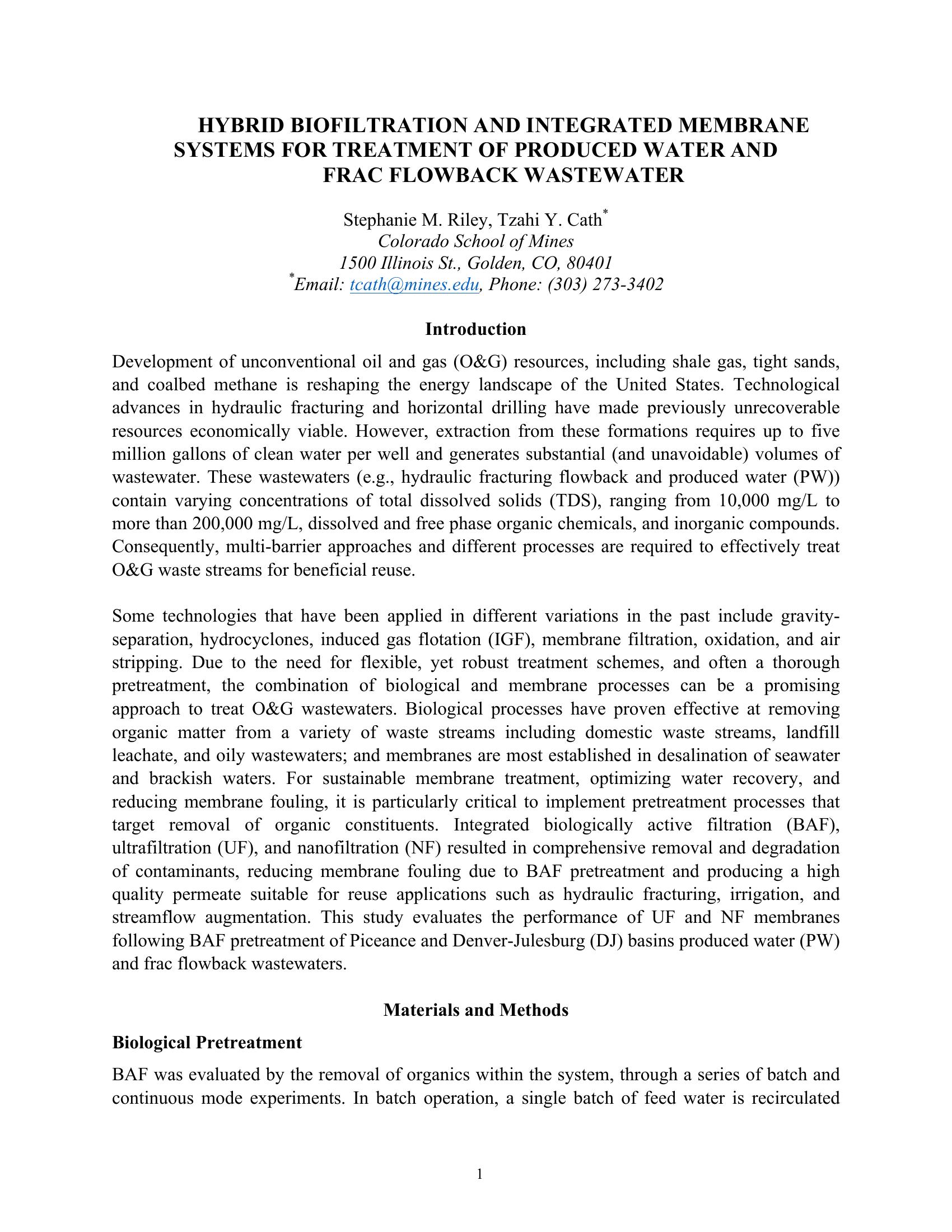 This study evaluates the performance of Ultrafiltration (UF) and Nanofiltration (NF) membranes following biologically active filtration (BAF) pretreatment of Piceance and Denver-Julesburg (DJ) basins produced water (PW) and frac flowback wastewaters.