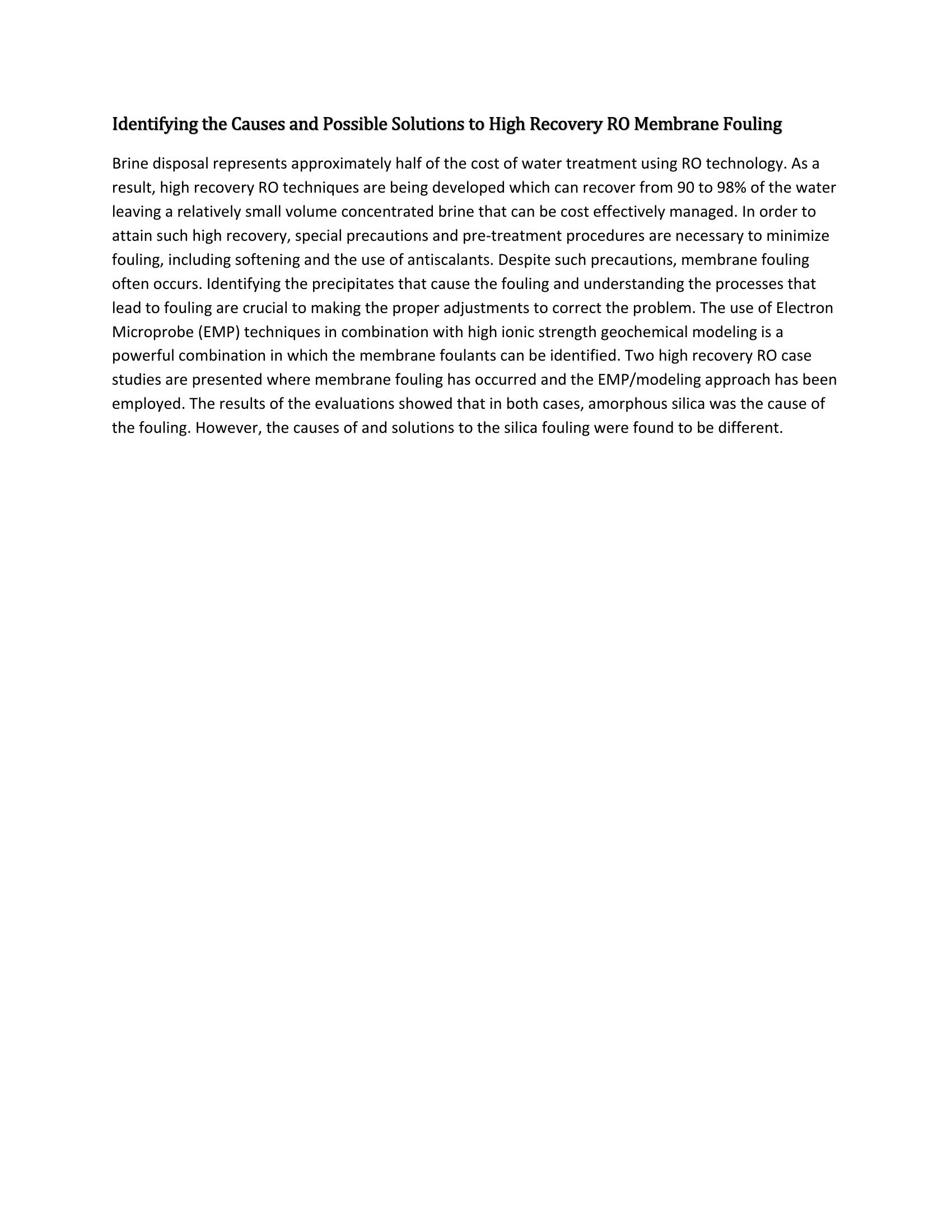 High recovery RO techniques are being developed which can recover from 90 to 98% of the water leaving a relatively small volume concentrated brine that can be cost effectively managed. In order to attain such high recovery, special precautions and pre-treatment procedures are necessary to minimize fouling, including softening and the use of antiscalants. The use of Electron Microprobe (EMP) techniques in combination with high ionic strength geochemical modeling is a powerful combination in which the membrane foulants can be identified. Two high recovery RO case studies are presented where membrane fouling has occurred and the EMP/modeling approach has been employed. The results of the evaluations showed that in both cases, amorphous silica was the cause of the fouling.