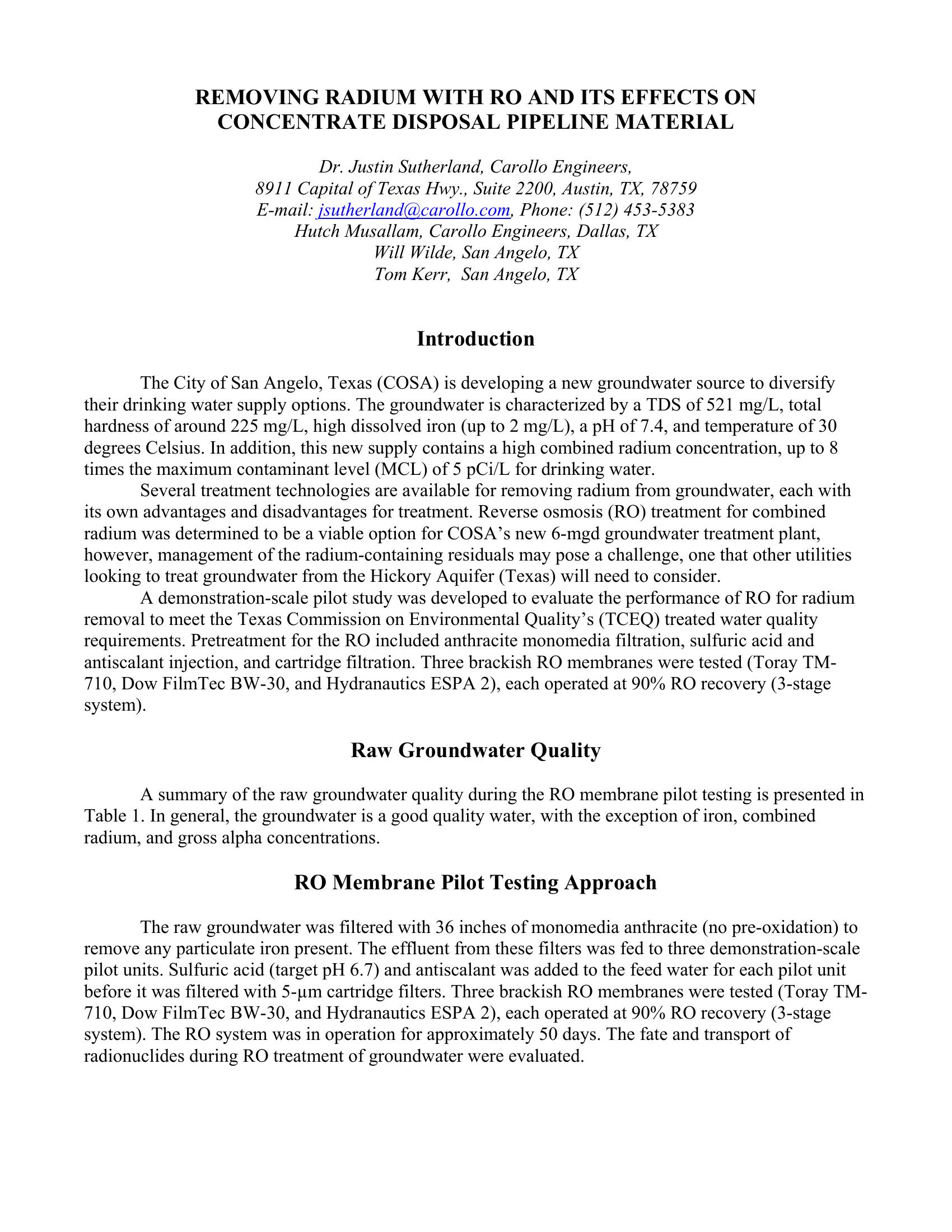 | Keywords | Radium Removal, reverse osmosis Pilot Study |