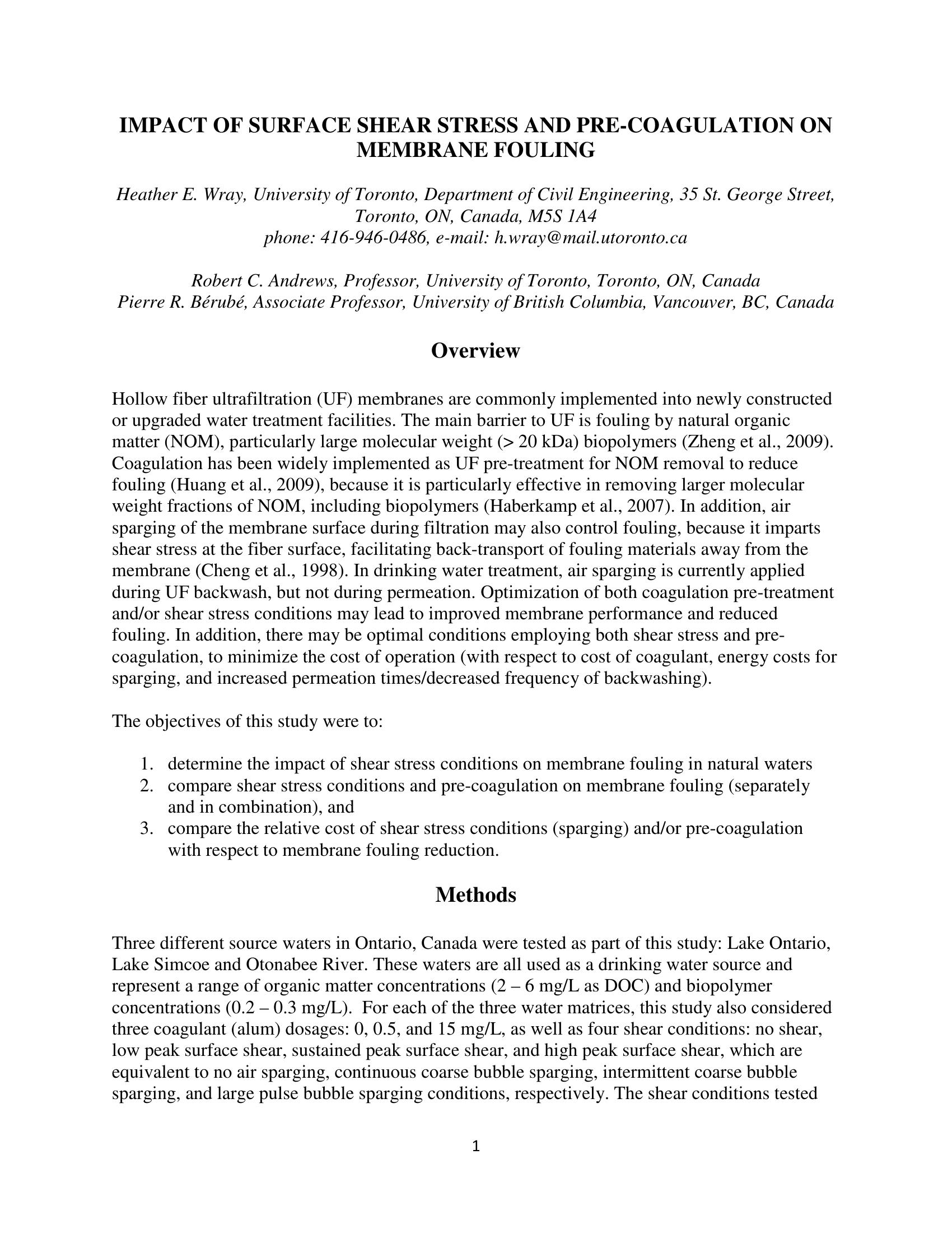 This paper documents a study intended to determine the impact of shear stress conditions on hollow fiber membrane fouling in natural waters, compare shear stress conditions and pre-coagulation on membrane fouling (separately and in combination), and compare the relative cost of shear stress conditions (sparging) and/or pre-coagulation with respect to membrane fouling reduction.