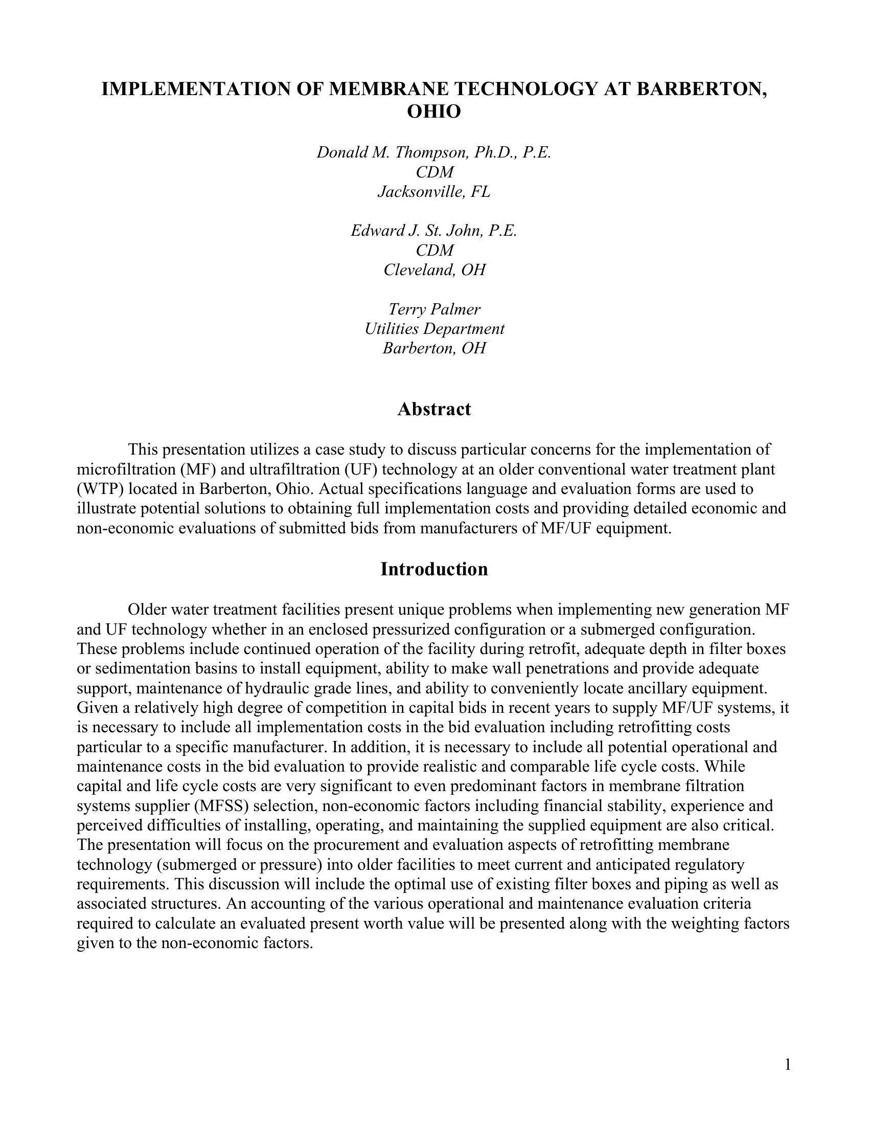 This paper describes concerns for the implementation of microfiltration (MF) and ultrafiltration (UF) technology at an older conventional water treatment plant located in Barberton, Ohio. Actual specifications language and evaluation forms are used to illustrate potential solutions to obtaining full implementation costs and providing detailed economic and non-economic evaluations of submitted bids.