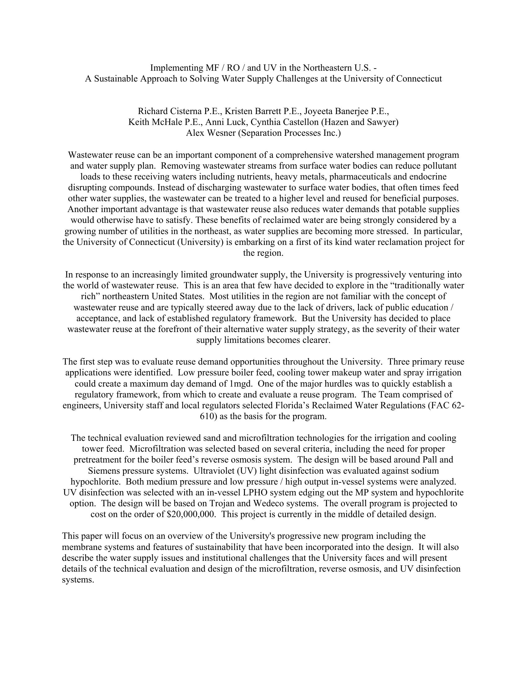 Implementing MF/ RO/and UV in the Northeastern US – A Sustainable Approach to Solving Water Supply Challenges at the University of Connecticut
