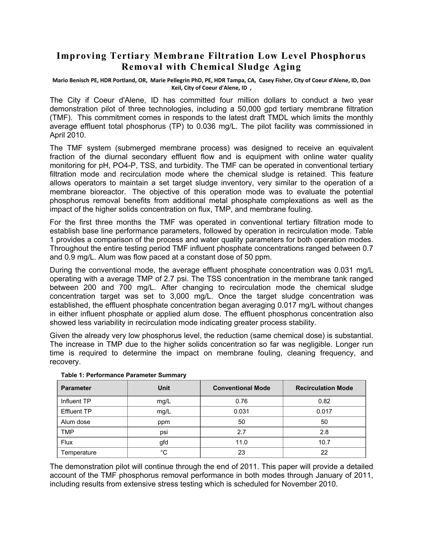| Keywords | Tertiary Membrane Filtration. Low Phosphorus, Chemical Phosphorus Removal |