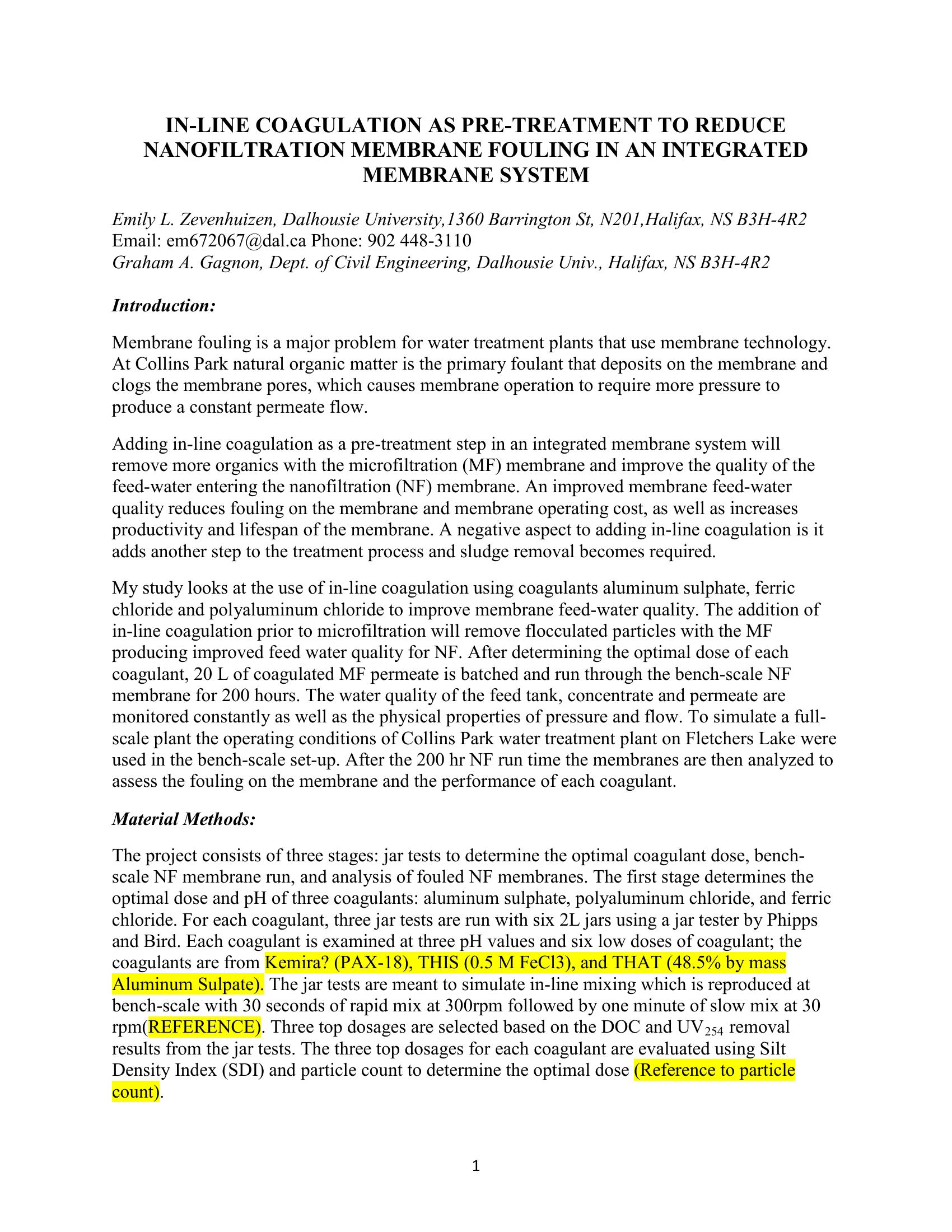 In-line coagulation for the Collins Park prior to microfiltration was investigated as a method to reduce fouling of the membranes and to enhance energy usage. Bench scale testing on Fletchers lake with different coagulants tested options for treatment of feed to the MF unit prior to nanofiltration.