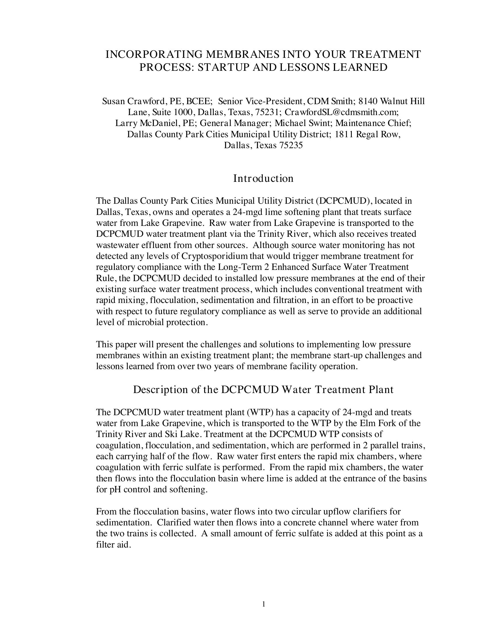 This paper will present the challenges and solutions to implementing low pressure membranes at the Dallas County Park Cities Municipal Utility District (DCPCMUD), plant that treats surface water from Lake Grapevine. The membrane start-up challenges and lessons learned from over two years of membrane facility operation are presented. The change at the facility was to be proactive with respect to future regulatory compliance as well as serve to provide an additional level of microbial protection.