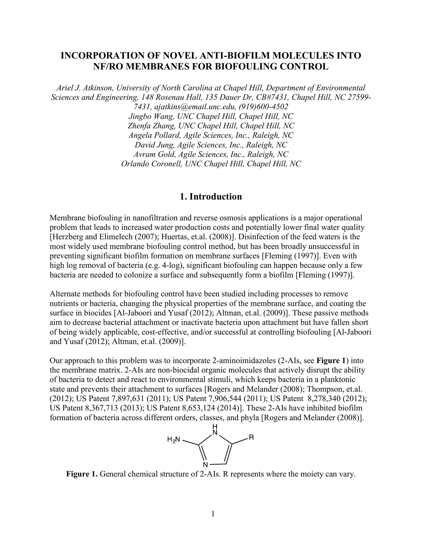 This paper describes research of incorporation 2-aminoimidazoles (2-A1) a anti-biofilm molecule into the NF/RO membrane matrix for fouling control. The specific objectives of this research were to: (1) determine whether a 2-AI would be amenable to incorporation into water purification membranes and maintain anti-biofilm activity once incorporated, (2) incorporate a 2-AI into the matrix of a commercial membrane, and (3) evaluate the performance of the 2-AI-membrane in comparison to a control membrane lacking 2- AI in terms of water permeability, salt rejection, and biofilm inhibition.