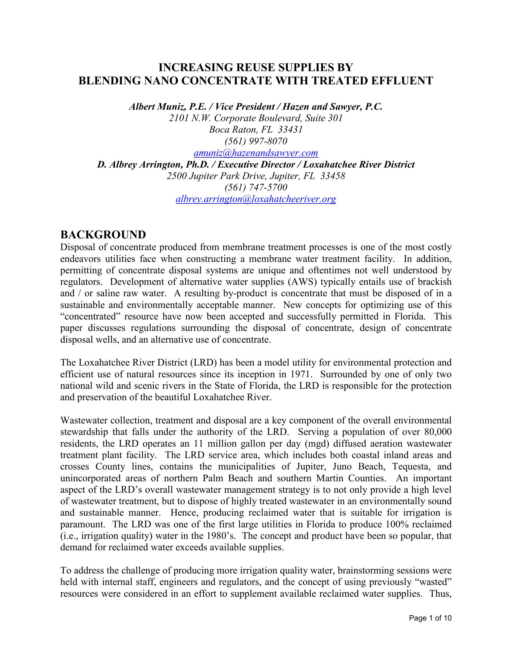 The Loxahatchee River District (LRD) was one of the first large utilities in Florida to produce 100% reclaimed water in the 1980s. LRD’s overal wastewater management strategy is to provide high level wastewater treatment and dispose of the highly treated wastewater in an environmentally sound and sustainable manner. The successful strategy of blending NF concentrate with reclaimed water allowed LRD to meet increased demand and has complied with all permit conditions.