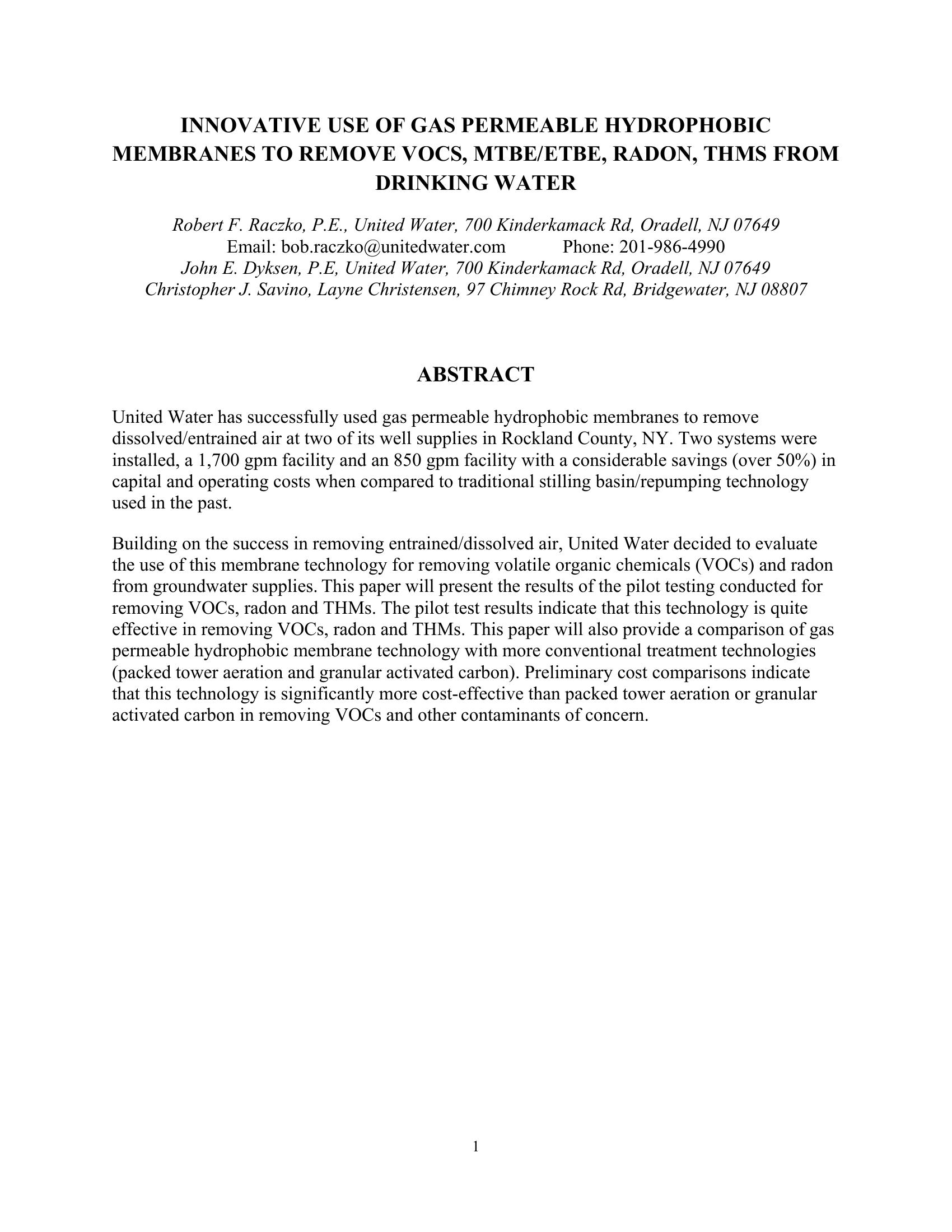 Innovative Use of Gas Permeable Hydrophobic Membranes to Remove VOCs, MTBE/ETBE, Radon, THMs from Drinking Water