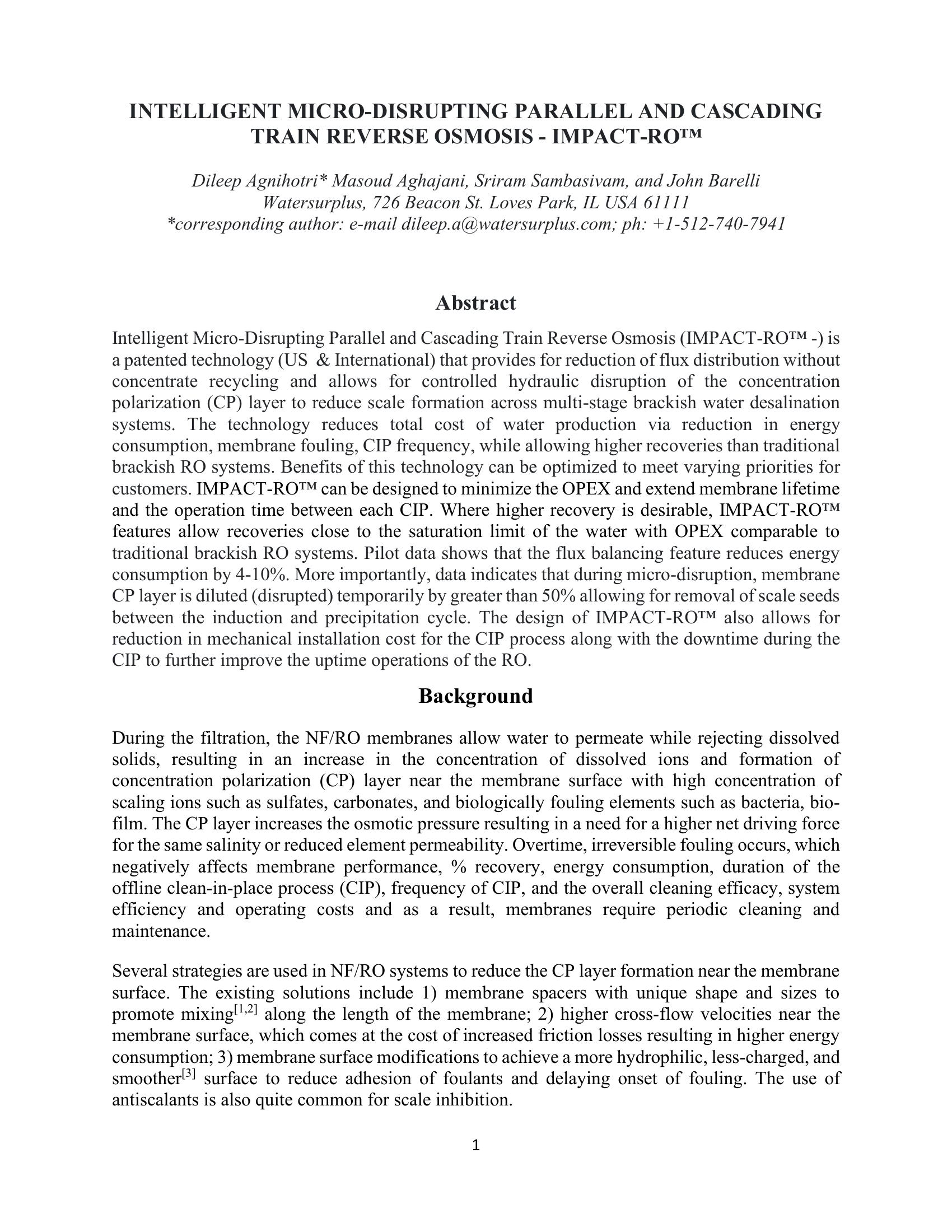 Intelligent Micro-Disrupting Parallel and Cascading Train Reverse Osmosis (IMPACT-ROô -) is a patented technology (US & International) that provides for reduction of flux distribution without concentrate recycling and allows for controlled hydraulic disruption of the concentration polarization (CP) layer to reduce scale formation across multi-stage brackish water desalination systems. The technology reduces total cost of water production via reduction in energy consumption, membrane fouling, CIP frequency, while allowing higher recoveries than traditional brackish RO systems. Benefits of this technology can be optimized to meet varying priorities for customers. IMPACT-ROô can be designed to minimize the OPEX and extend membrane lifetime and the operation time between each CIP. Where higher recovery is desirable, IMPACT-ROô features allow recoveries close to the saturation limit of the water with OPEX comparable to traditional brackish RO systems. Pilot data shows that the flux balancing feature reduces energy consumption by 4-10%. More importantly, data indicates that during micro-disruption, membrane CP layer is diluted (disrupted) temporarily by greater than 50% allowing for removal of scale seeds between the induction and precipitation cycle. The design of IMPACT-ROô also allows for reduction in mechanical installation cost for the CIP process along with the downtime during the CIP to further improve the uptime operations of the RO.