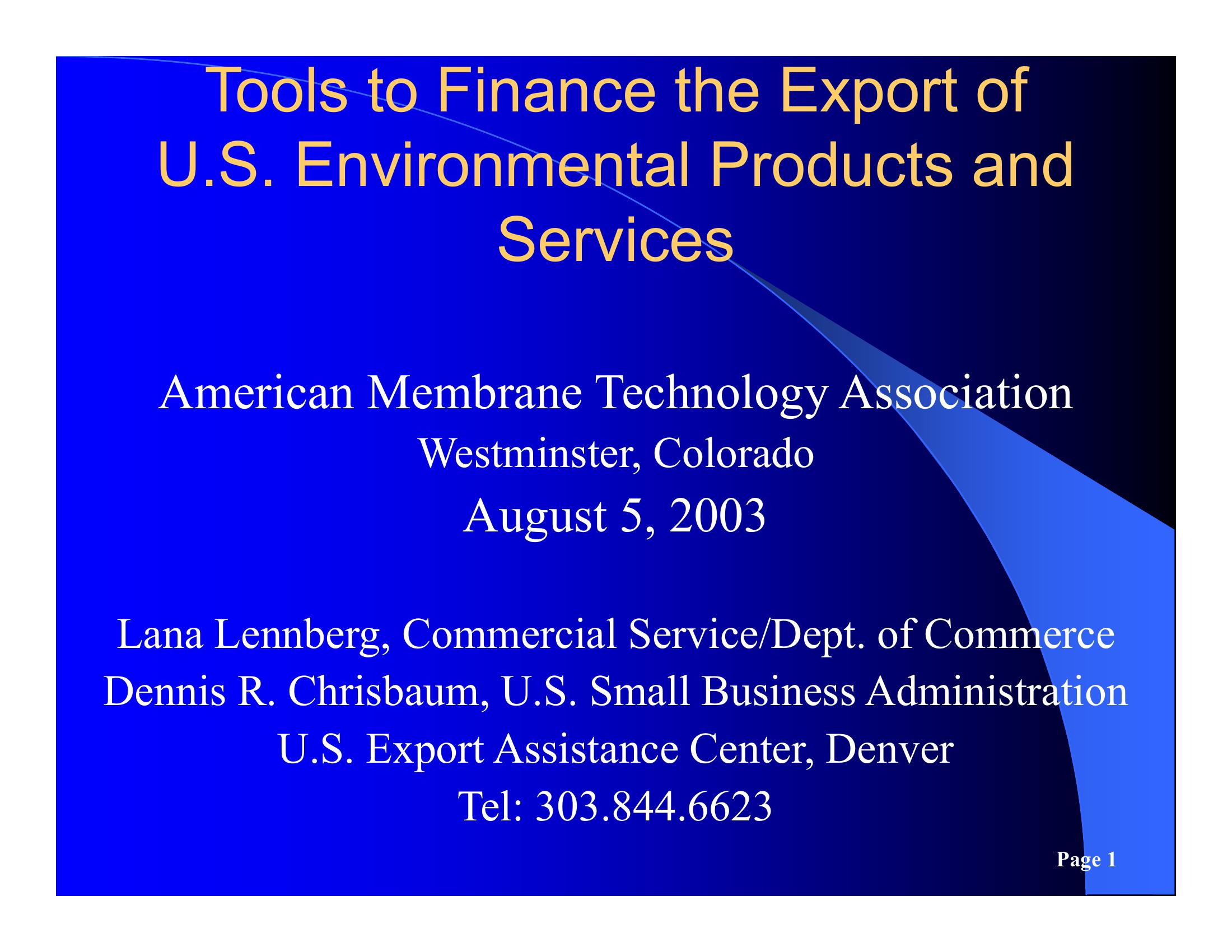 Briefing by the US Department of Commerce on the export of US membrane technology overseas. Department’s role in promoting exports is outlined as well as related financing opportunities.