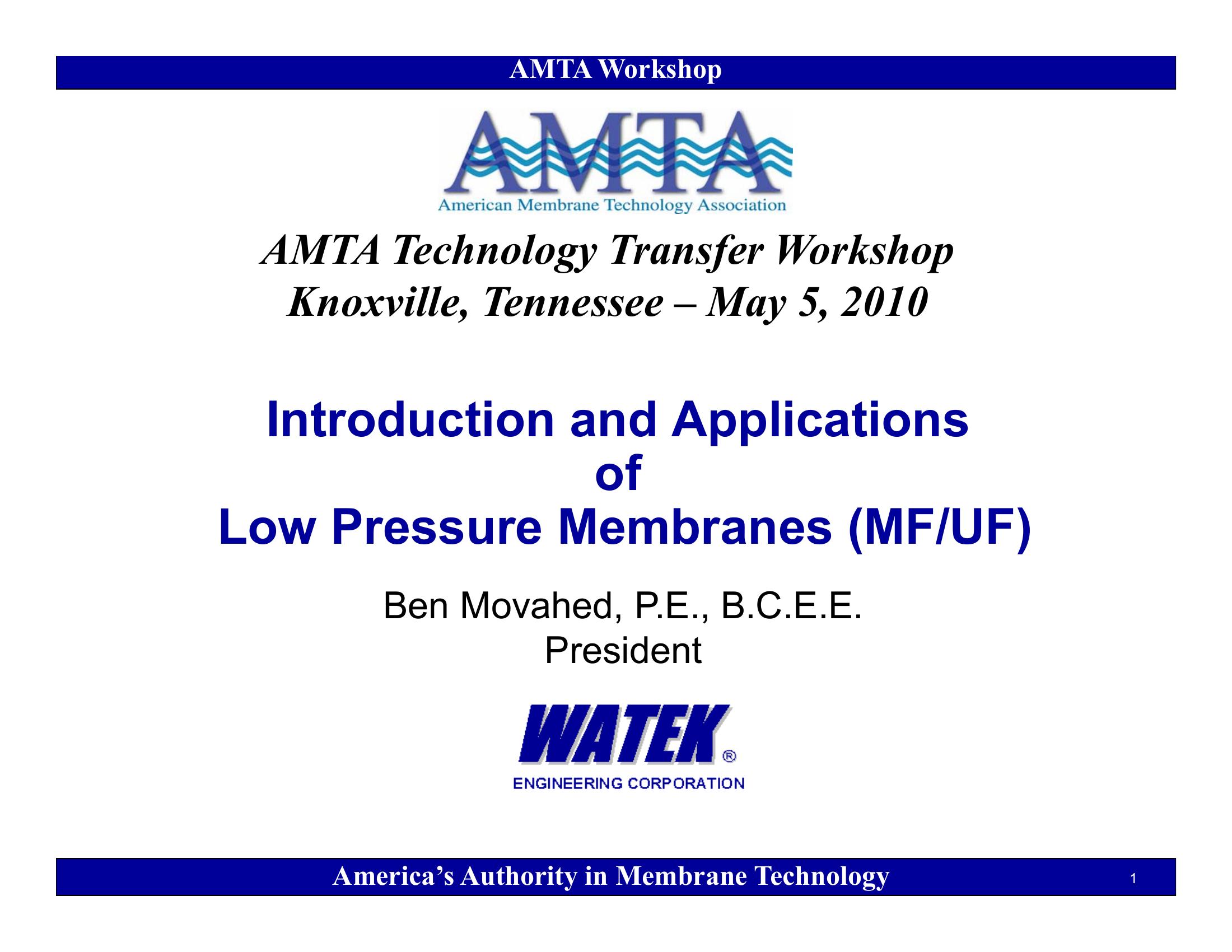 Overview of low pressure microfiltration and ultrafiltration membrane technologies including types, procurement, cleaning, maintenance, performance and integrity tests, costs and applicable regulations.