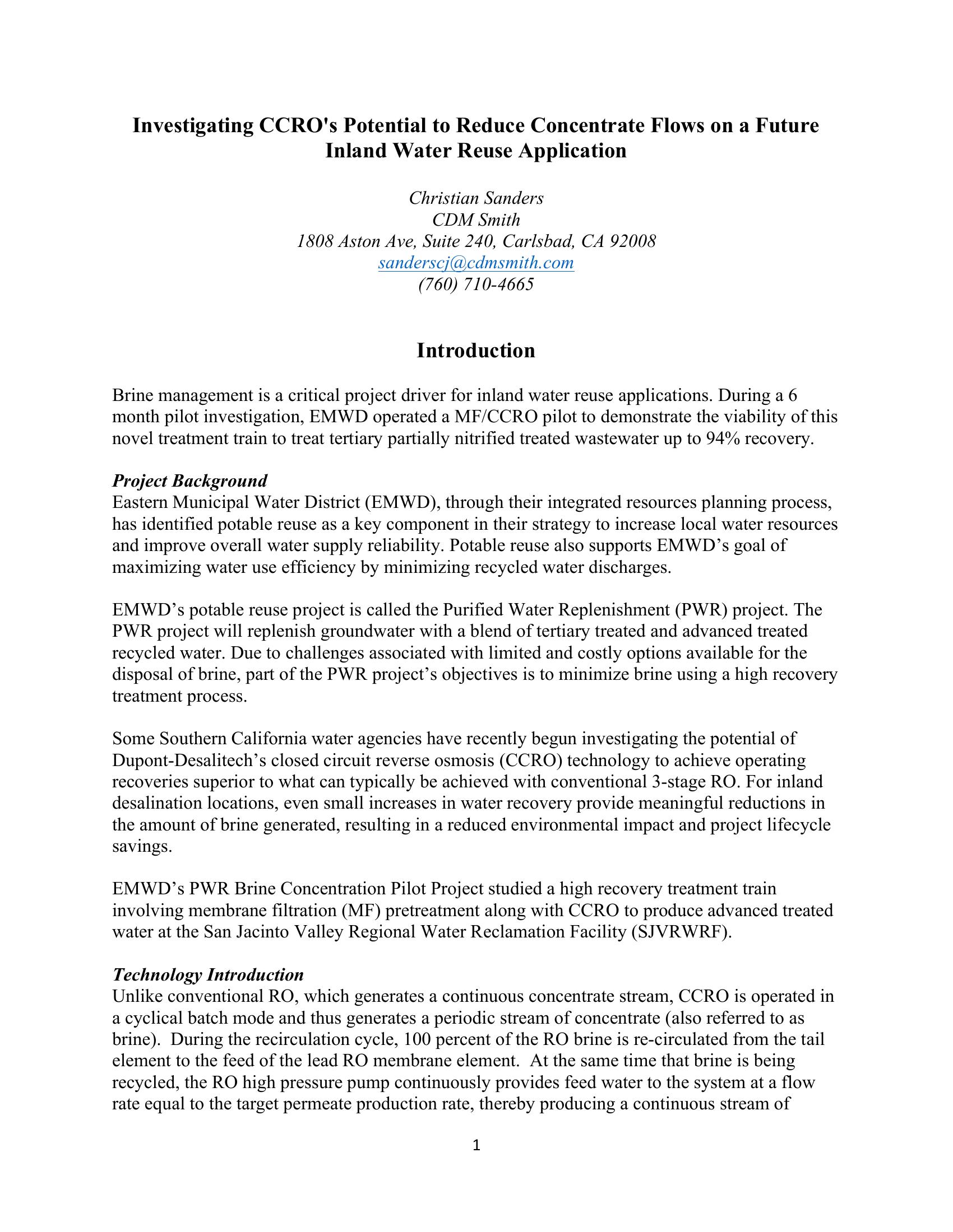 Investigating CCRO’s Potential to Reduce Concentrate Flows on a Future Inland Water Reuse Application