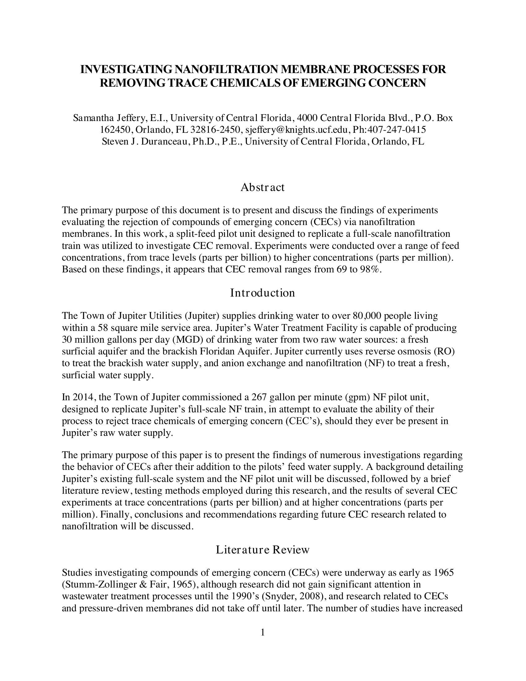 This paper discusses the findings of experiments evaluating the rejection of compounds of emerging concern (CECs) via nanofiltration membranes. In addition a description of the Town of Jupiter NF facilities and pilot plant efforts are presented.