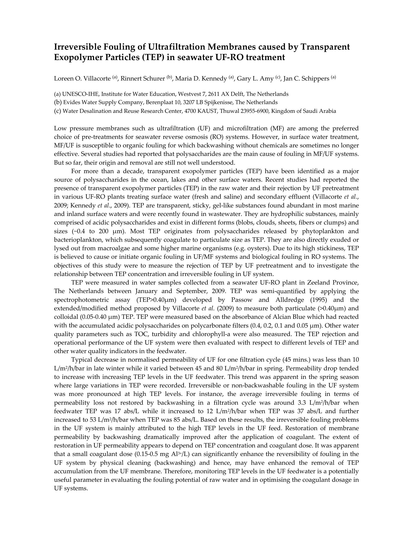 Irreversible Fouling of Ultrafiltration Membranes Caused by Transparent Exoplymer Particles (TEP) in Seawater UF-RO Treatment