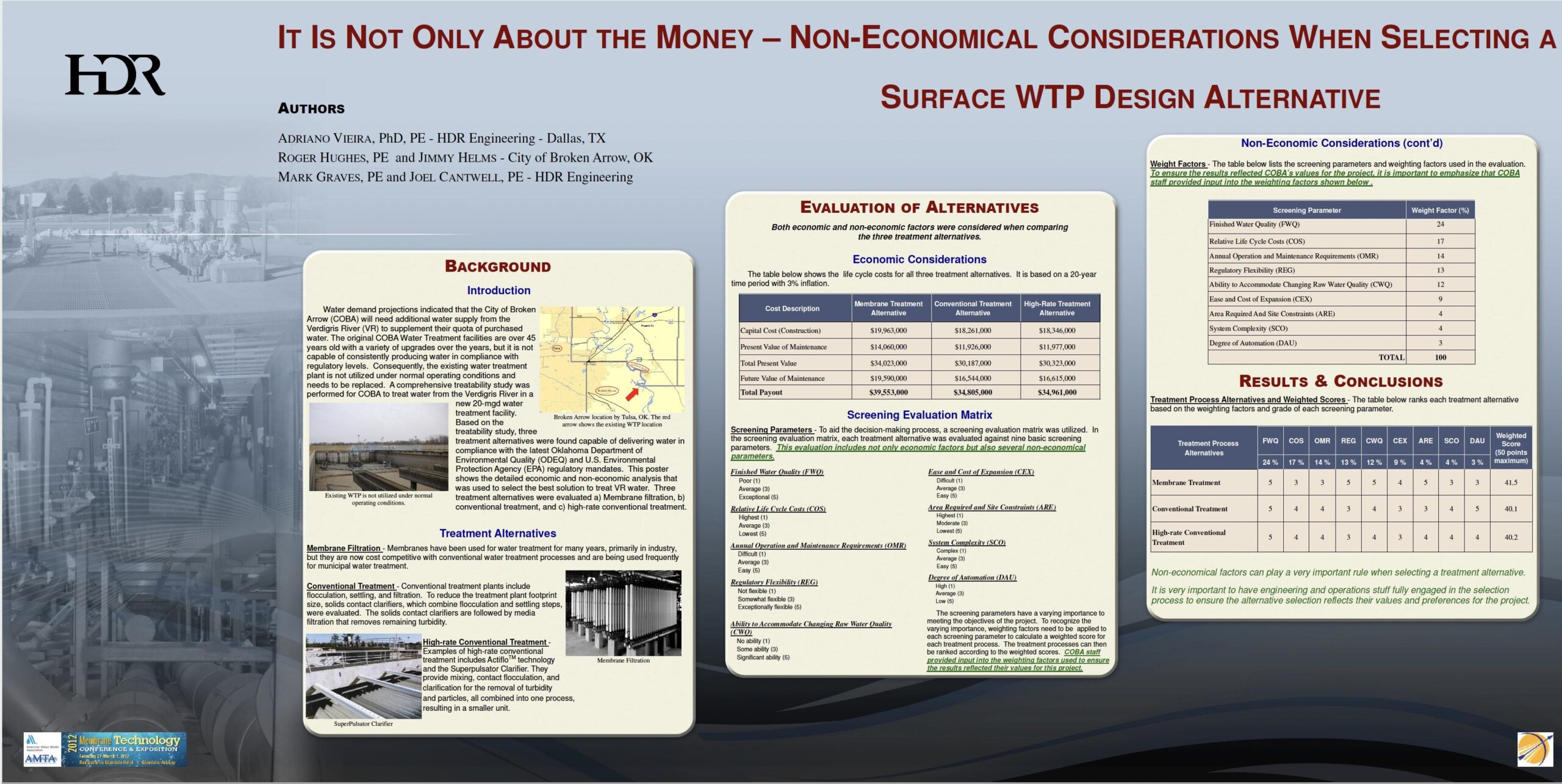 This presentation will help owners and engineers understand the implications of several noneconomic factors that need to be considered when selecting among viable technical solutions for treating surface waters. Water demand projections indicated that the City of Broken Arrow (COBA) will need additional water supply from the Verdigris River (VR) to supplement their quota of purchased water. The original COBA Water Treatment facilities are over 45 years old with a variety of upgrades over the years, but it is not capable of consistently producing water in compliance with regulatory levels. Consequently, the existing water treatment plant is not utilized under normal operating conditions and needs to be replaced. A comprehensive treatability study was performed for COBA to treat water from the Verdigris River in a new 20-mgd water treatment facility. Based on the treatability study, three treatment alternatives were found capable of delivering water in compliance with the latest Oklahoma Department of Environmental Quality (ODEQ) and U.S. Environmental Protection Agency (EPA) regulatory mandates. After a detailed economic and non-economic analysis, membrane filtration was found to be the best solution to treat VR water when compared to conventional and high-rate conventional treatment alternatives.