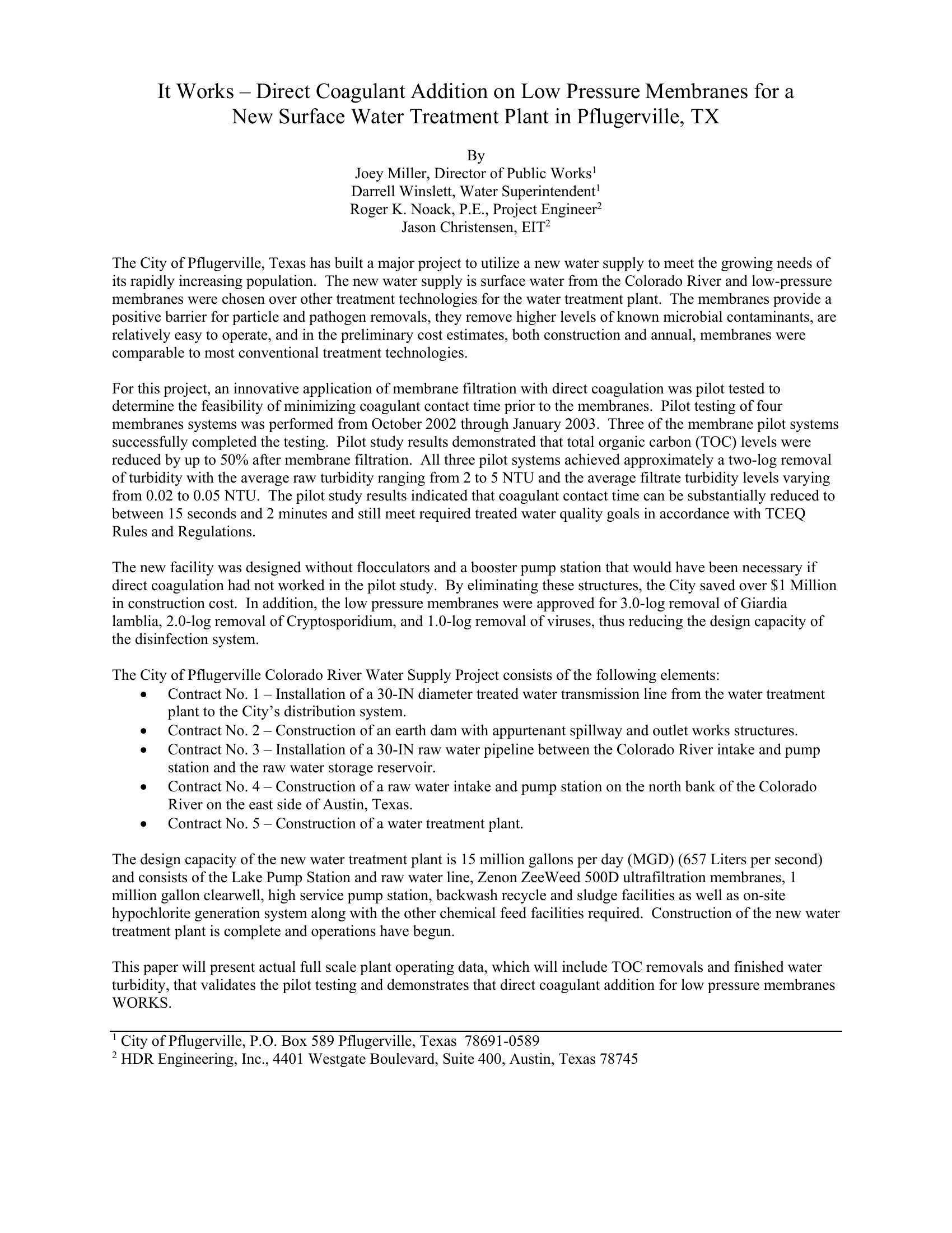 This paper will present actual full scale plant operating data, which will include TOC removals and finished water turbidity, that validates the pilot testing and demonstrates that direct coagulant addition for low pressure membranes WORKS. The City of Pflugerville, Texas has built a major project to utilize a new water supply to meet the growing needs of its rapidly increasing population