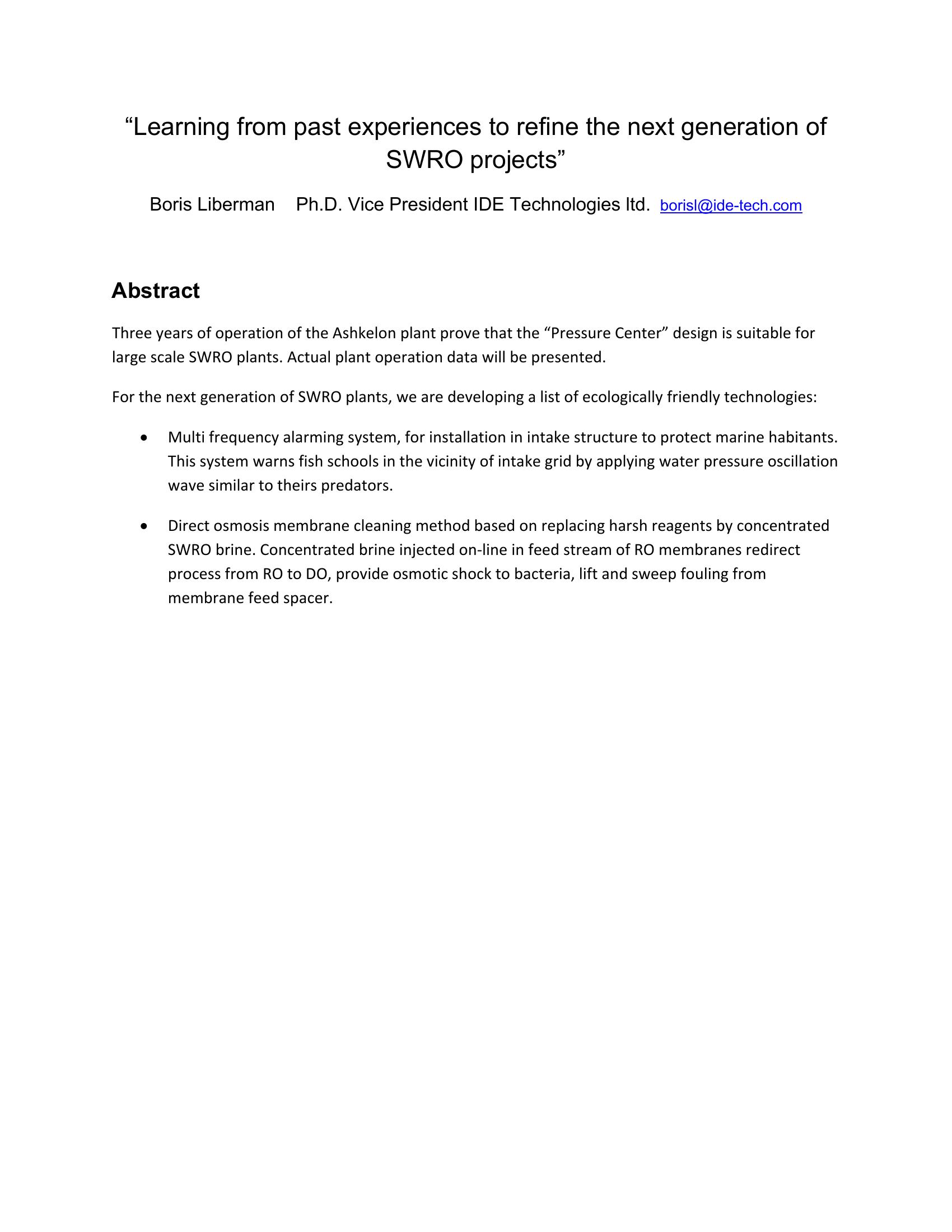 This paper talks about lessons learned fom operation of the Ashkelon plant. The ?Pressure Center? design is suitable for large scale SWRO plants. For the next generation of SWRO plants, we are developing a list of ecologically friendly technologies: Multi frequency alarming system, for installation in intake structure to protect marine habitants. This system warns fish schools in the vicinity of intake grid by applying water pressure oscillation wave similar to theirs predators. Direct osmosis membrane cleaning method based on replacing harsh reagents by concentrated SWRO brine. Concentrated brine injected on?line in feed stream of RO membranes redirect process from RO to DO, provide osmotic shock to bacteria, lift and sweep fouling from membrane feed spacer.
