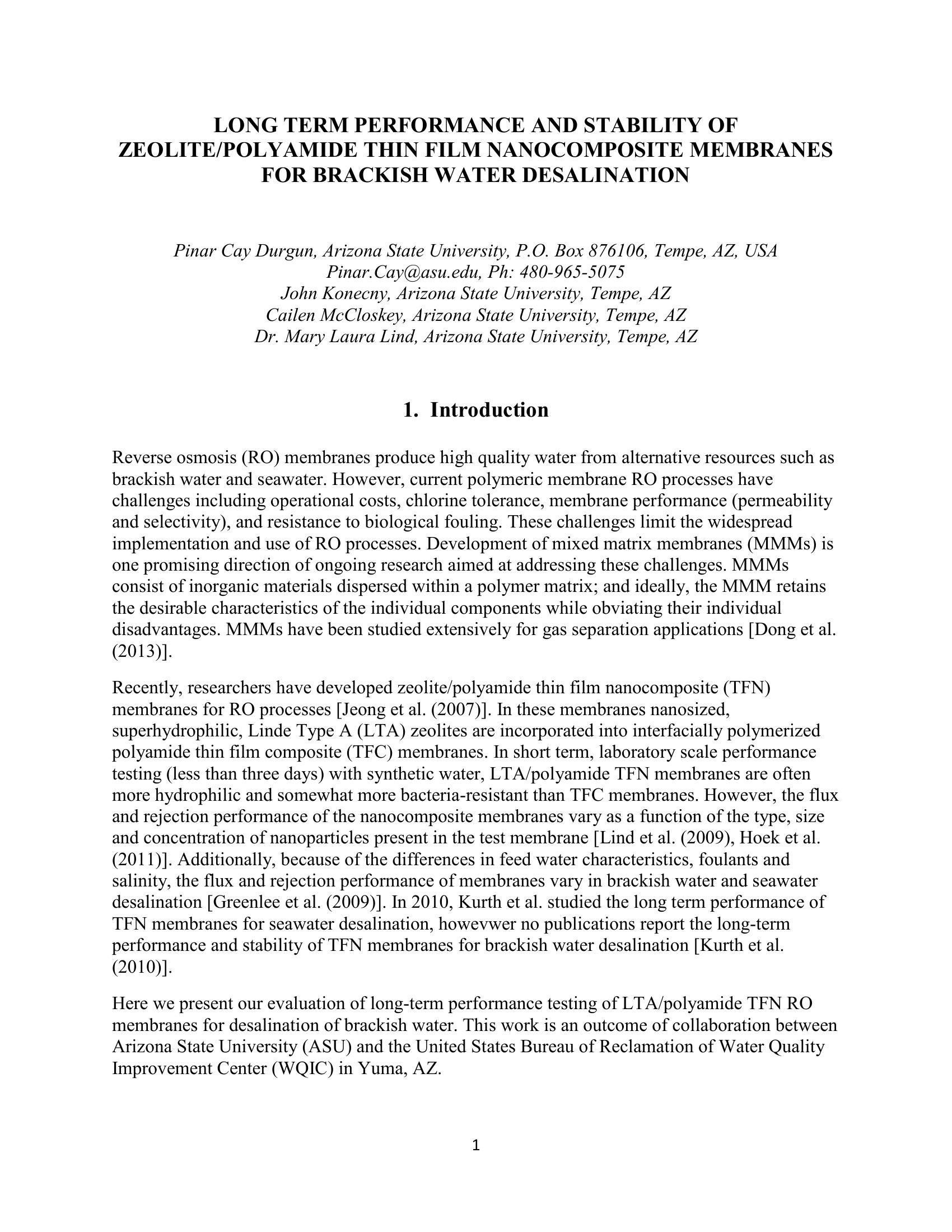 In work is a collaboration between the Arizona State University (ASU) and the United States Bureau of Reclamation Water Quality Improvement Center (WQIC) in Yuma, AZ. The paper presents the results of long-term performance testing of Linde Type A (LTA) Polyamide Thin Film Nanocomposite Reverse Osmosis membranes for desalination of brackish water.