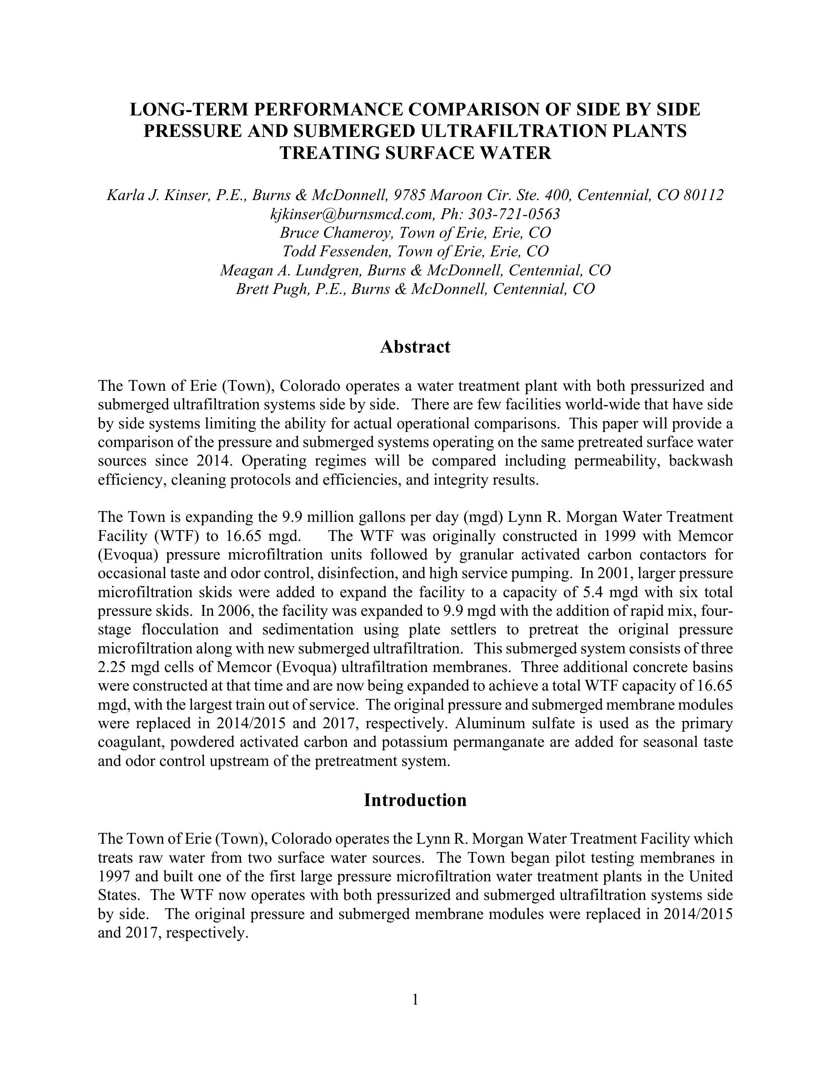 Long-Term Performance Comparison of Side by Side Pressure and Submerged Ultrafiltration Plants Treating Surface Water