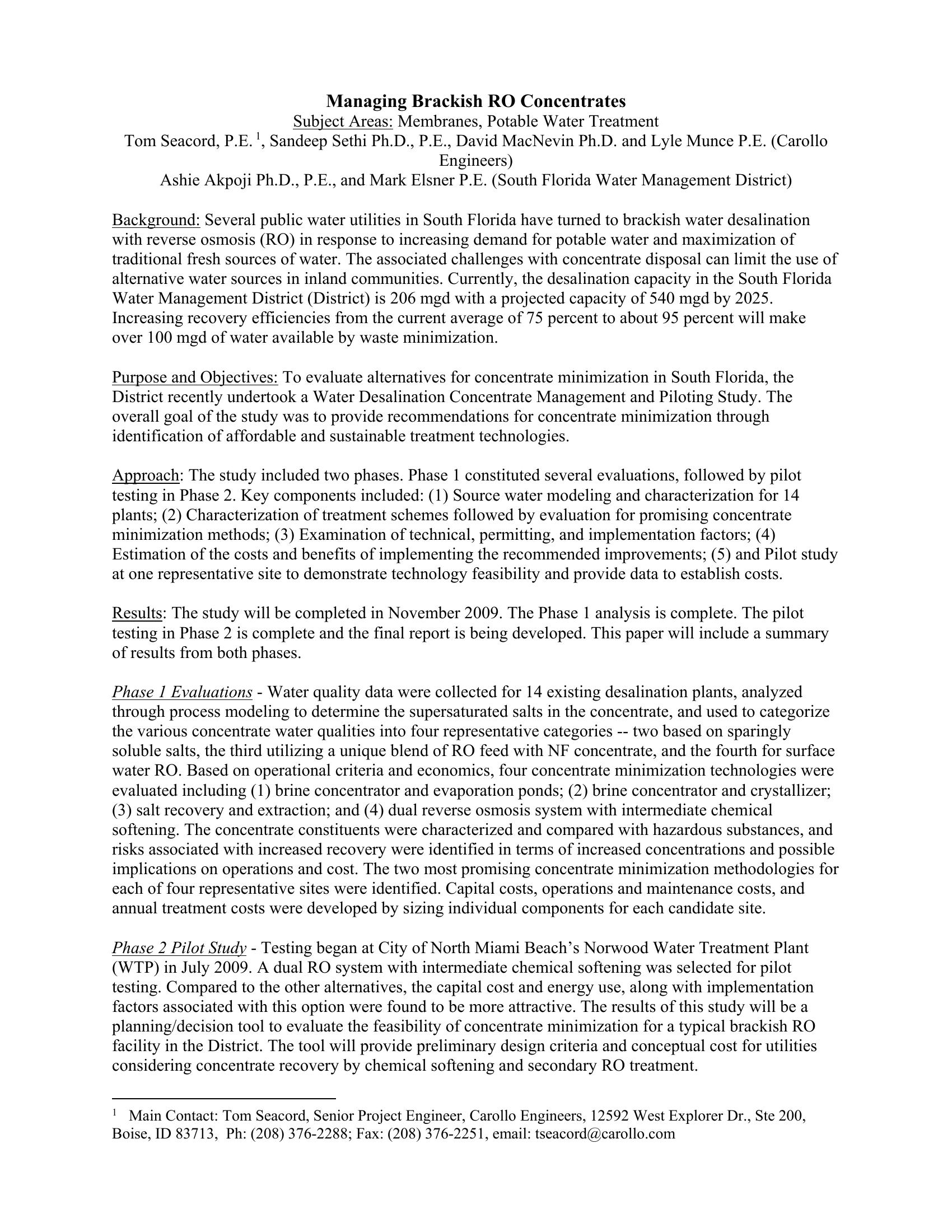 Average brackish water RO recovery is about 75% in southern Florida. With an anticipated capacity of 540 mgd by 2025 and increase in recovery to 95% would yield over 100 mgd of potable water. A two phase study was conducted to evaluate possible concentrate management techniques to increase RO recovery. Stage 1 involved a literature review and feasibility analysis and Stage 2 included pilot testing of the chosen method. The test train included RO-perceptive softening to remove concentrated salts-Media filtration-Second Stage RO and blending. The testing proved to produce a combined permeate TDS of 250 mg/L, below the goal of 500 mg/L.