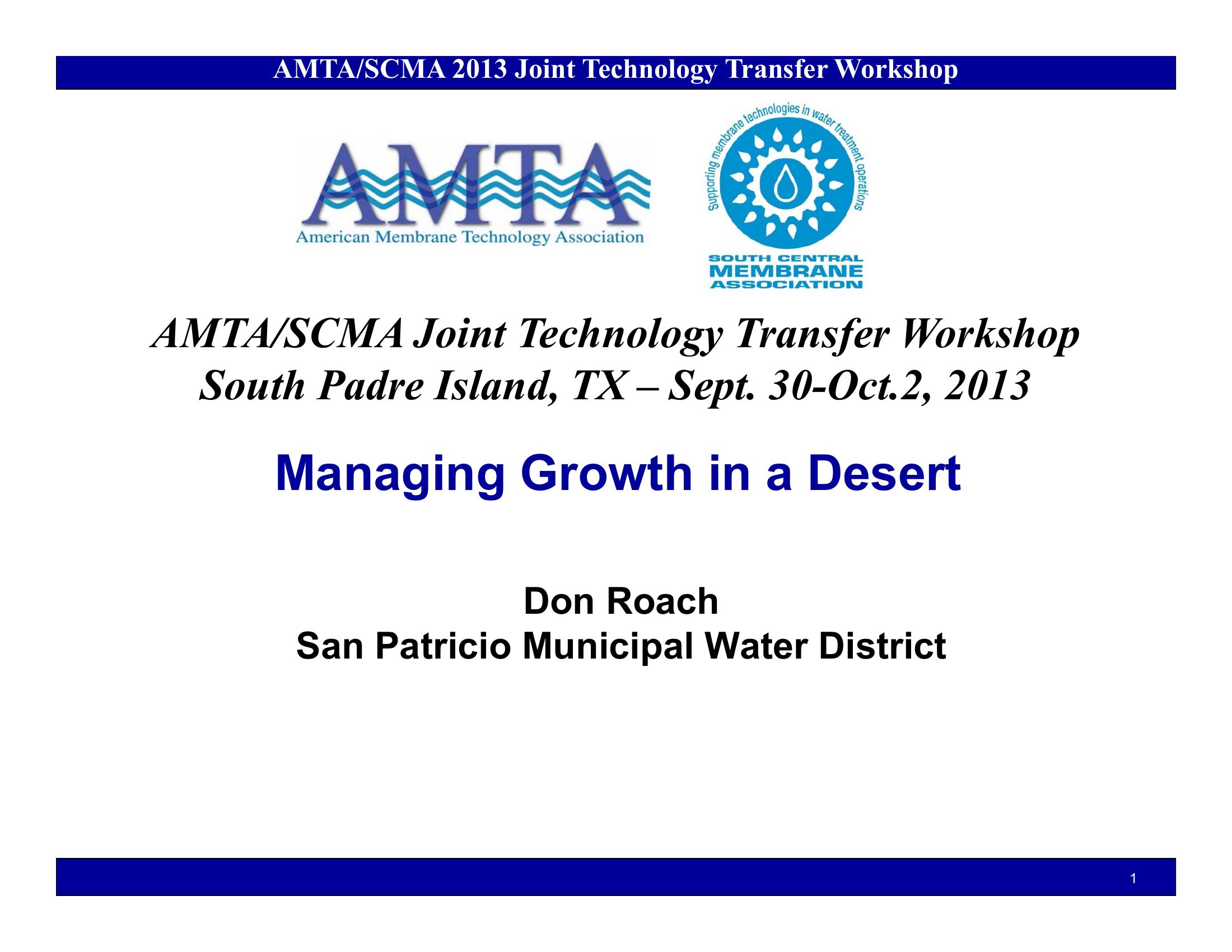 This PowerPoint reviews the growth of water treatment and the microfiltration plant for the San Patricio Municipal Water District. Future options for seawater and additional membrane facilities are also discuses.