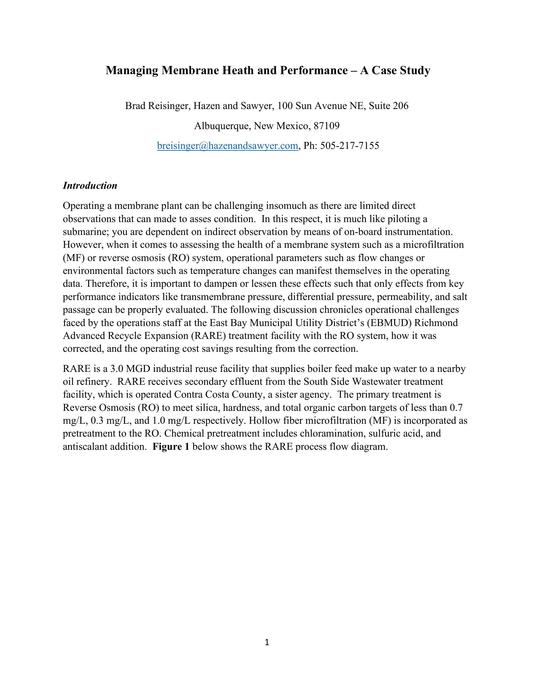 Operating a membrane plant can be challenging insomuch as there are limited direct observations that can made to asses condition. In this respect, it is much like piloting a submarine; you are dependent on indirect observation by means of on-board instrumentation. However, when it comes to assessing the health of a membrane system such as a microfiltration (MF) or reverse osmosis (RO) system, operational parameters such as flow changes or environmental factors such as temperature changes can manifest themselves in the operating data. Therefore, it is important to dampen or lessen these effects such that only effects from key performance indicators like transmembrane pressure, differential pressure, permeability, and salt passage can be properly evaluated. The following discussion chronicles operational challenges faced by the operations staff at the East Bay Municipal Utility Districtís (EBMUD) Richmond Advanced Recycle Expansion (RARE) treatment facility with the RO system, how it was corrected, and the operating cost savings resulting from the correction.