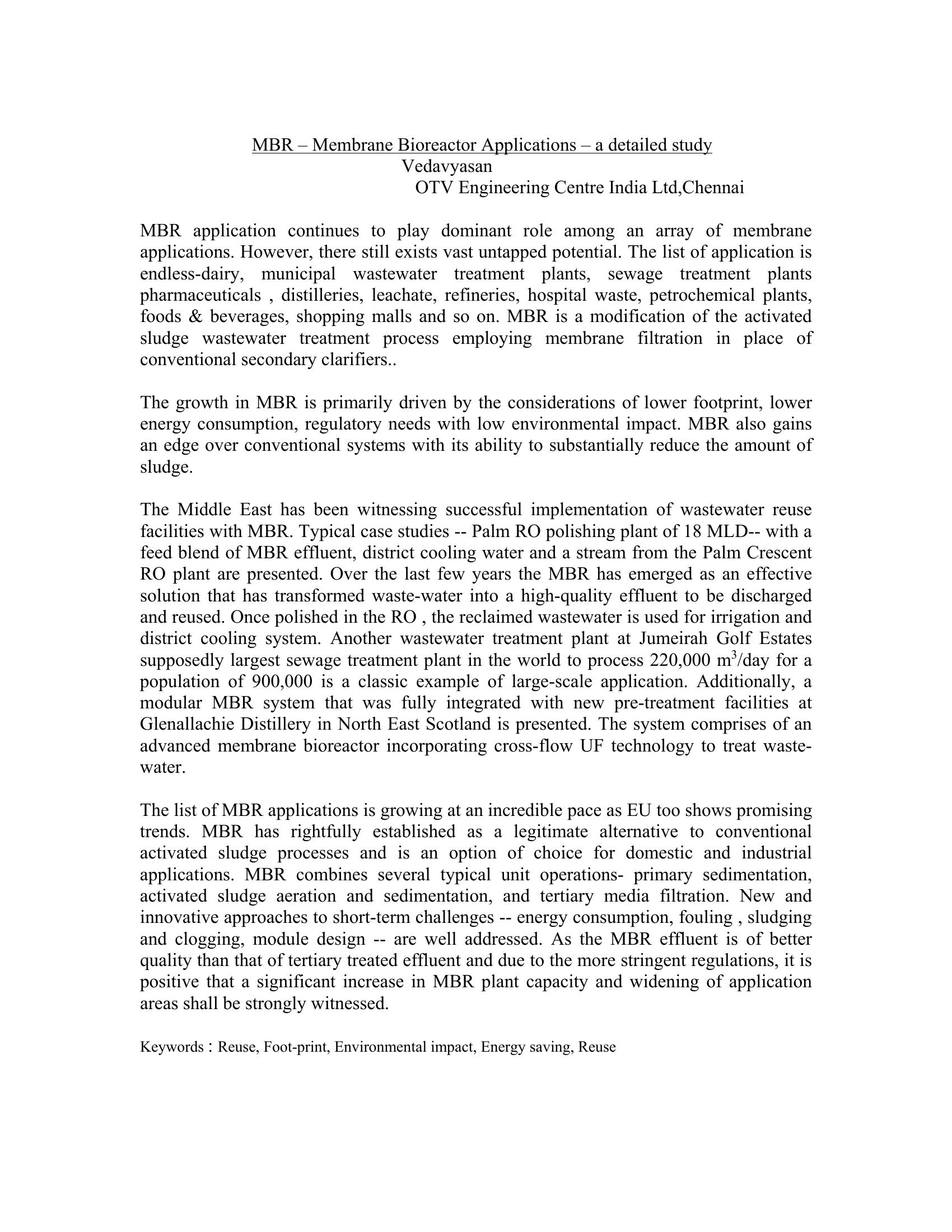 This paper discusses growing applications of MBR technology for treatment of various wastewater from municipal and industrial applications. The use of MBR combined with RO for reuses is also discussed. The advantage of MBR over other treatment methods is presented.