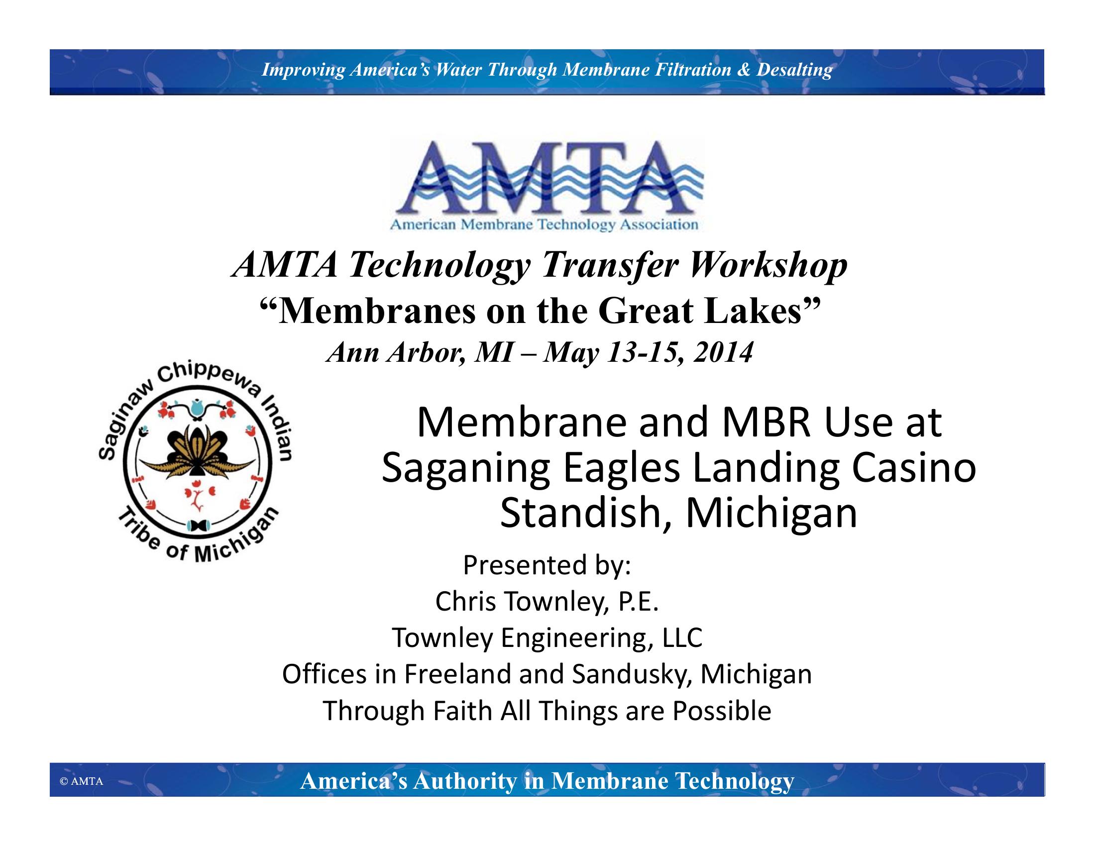 This presentation discusses the water and wastewater treatment plants at the Saganing Eagles Landing Casino in Standish, Michigan. The presentation includes an overview of treatment infrastructure including an ultrafiltration (UF) membrane system at the water treatment plant and a membrane bioreactor (MBR) at the wastewater treatment plant (WWTP). Membrane cleaning requirements are compared between the two facilities and WWTP performance is summarized.