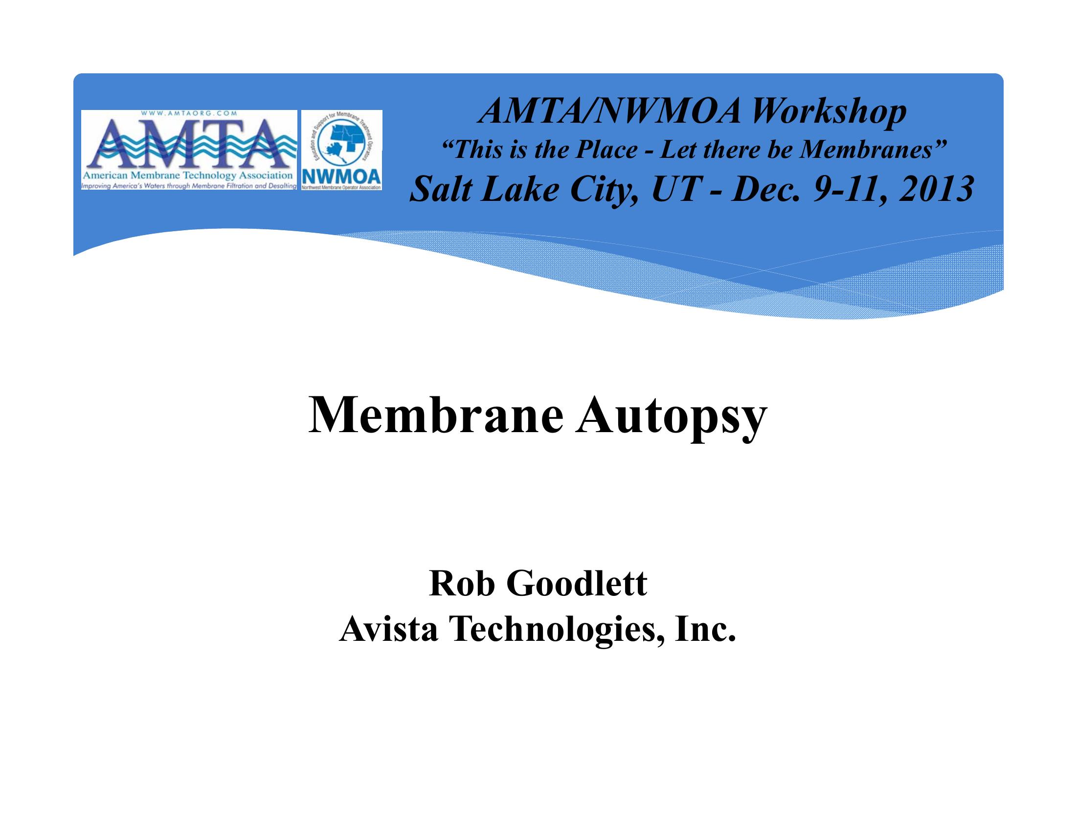 This presentation discusses autopsy procedures for reverse osmosis (RO) membranes. The presentation includes procedures for identifying physical membrane damage, particulate fouling, organic fouling, scaling, and biological fouling. Testing procedures discussed include visual inspection, the Fujiwara test, energy dispersive X-ray analysis, and Chromatic Elemental Imaging.