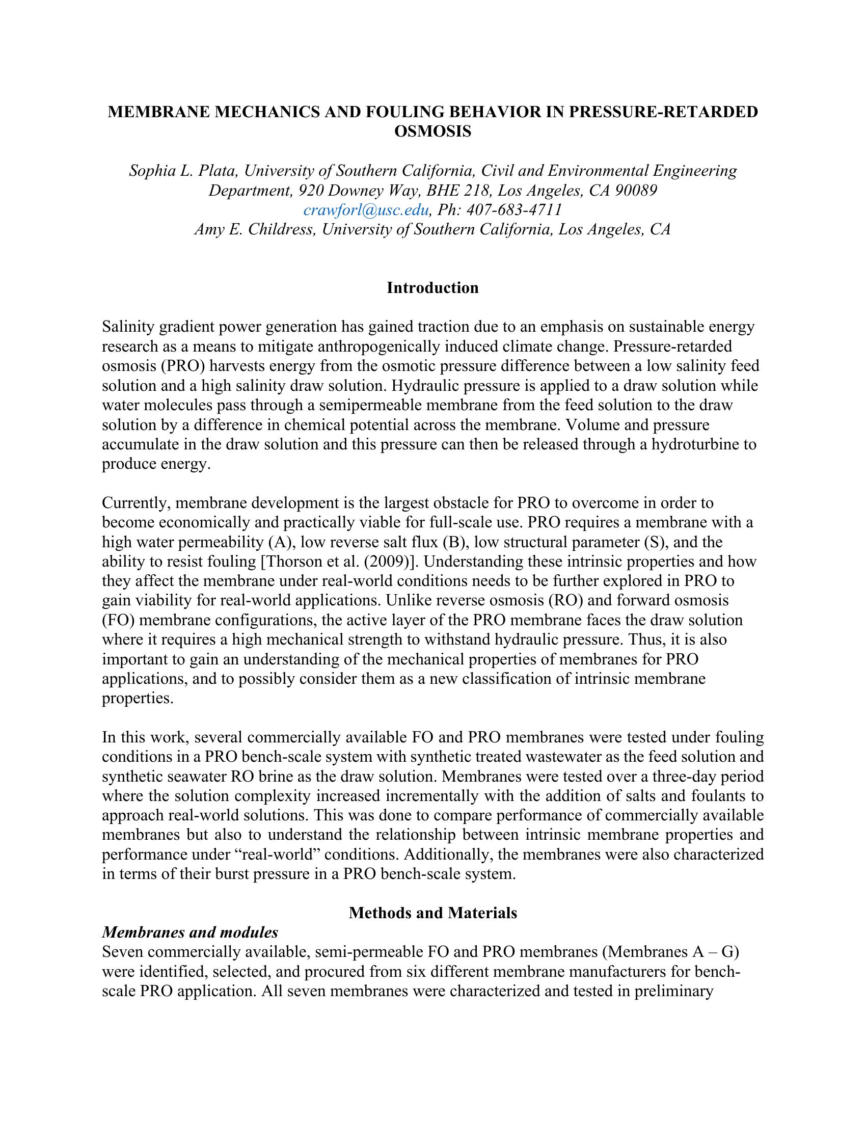 | Keywords | Pressure-Retarded Osmosis, Salinity, Fouling |