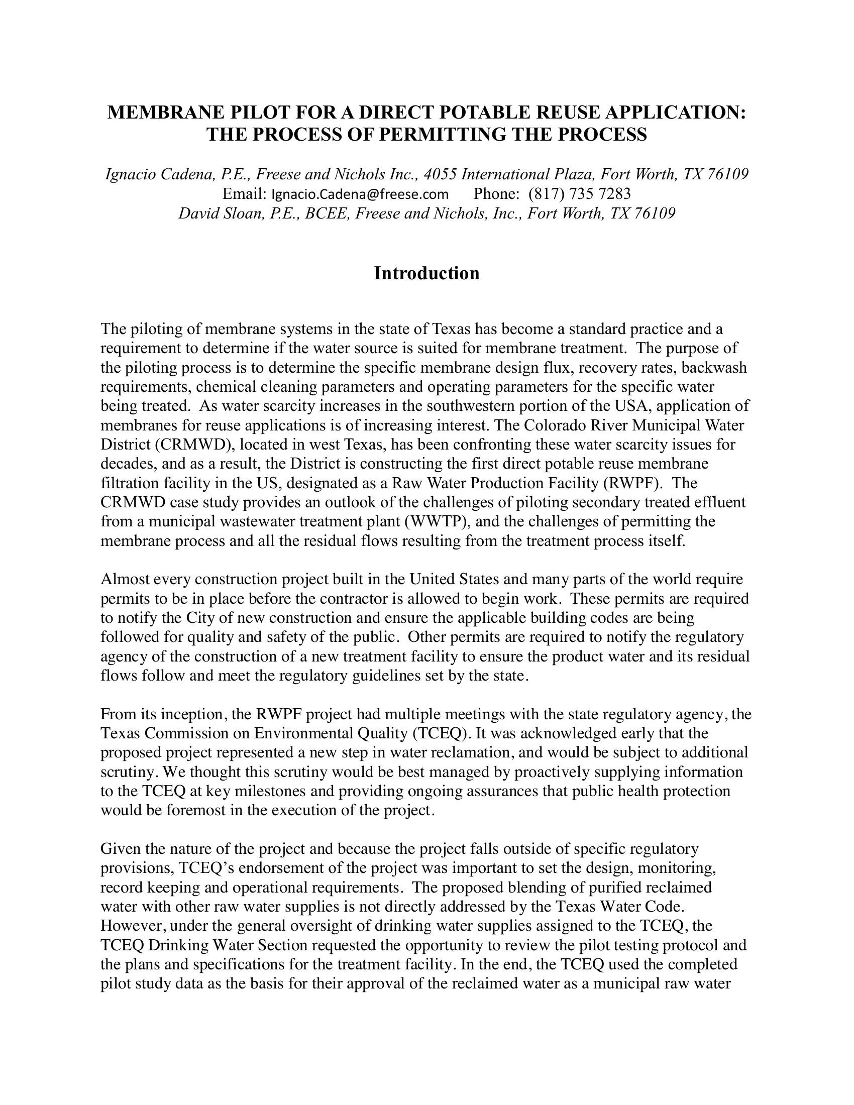 The purpose of this paper is to describe the permitting process associated with reclaiming wastewater effluent to be further treated into potable drinking water. Because of the risks associated with this concept, the permitting process became an important step in a string of equally important engineering tasks. The permitting process of the Big Spring Water Reclamation Facility was a process that started in 2008 with the approval of the Membrane Pilot Testing Protocol. With the approval of the protocol the District pre-qualified membrane suppliers to execute the pilot study following the testing protocol guidelines. The pilot study results were submitted to TCEQ and the District was granted the request to use membranes to treat secondary effluent for use as a supplemental water supply.