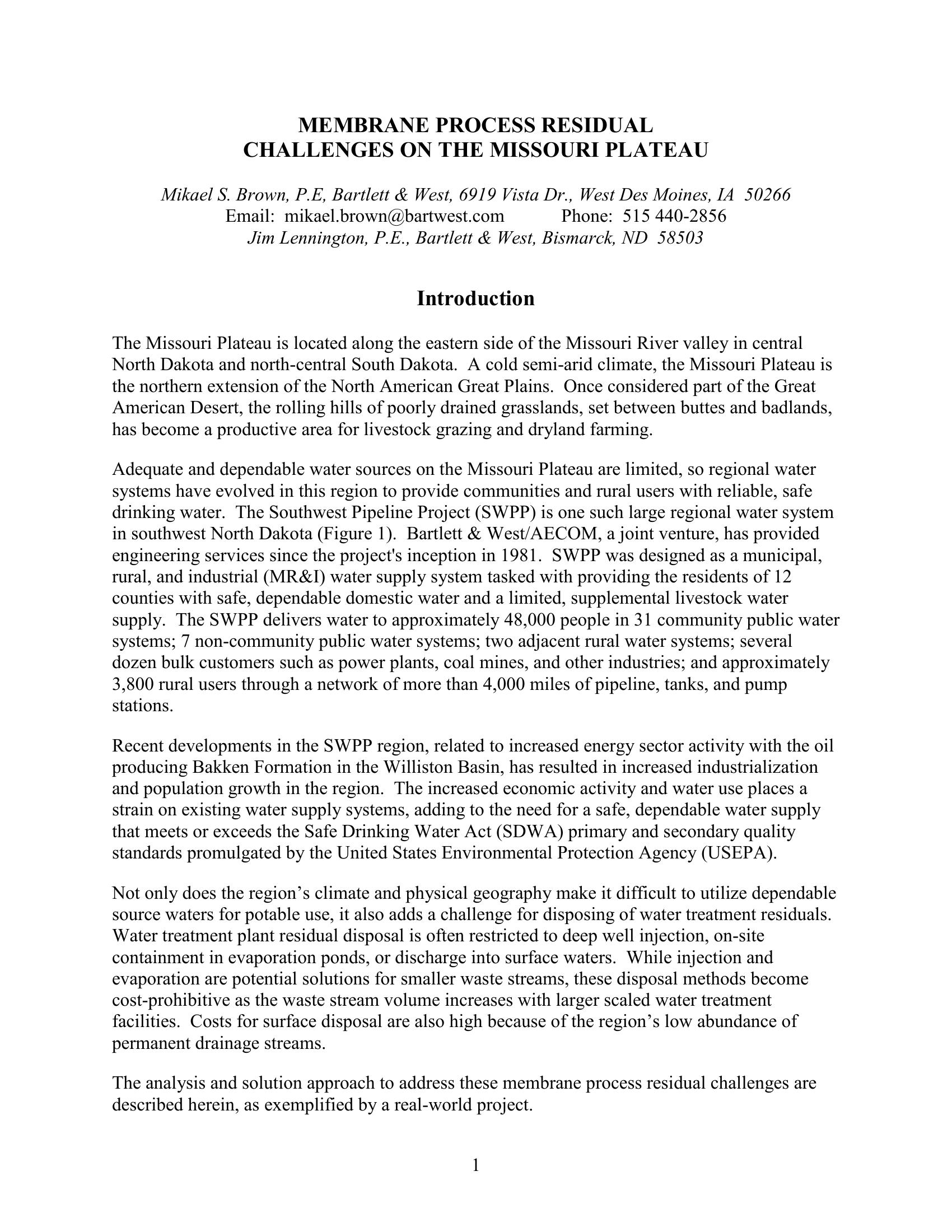 The cold semi-arid climate of the Missouri Plateau of North Dakota adds several challenges for water and wastewater facilities in the region. Adequate and dependable water sources are limited, so regional water systems have evolved to provide communities and rural users with reliable, safe drinking water. Because of the region?s climate and physical geography, water treatment plant residual disposal is often restricted to deep well injection, evaporation ponds, or discharge back into source waters.