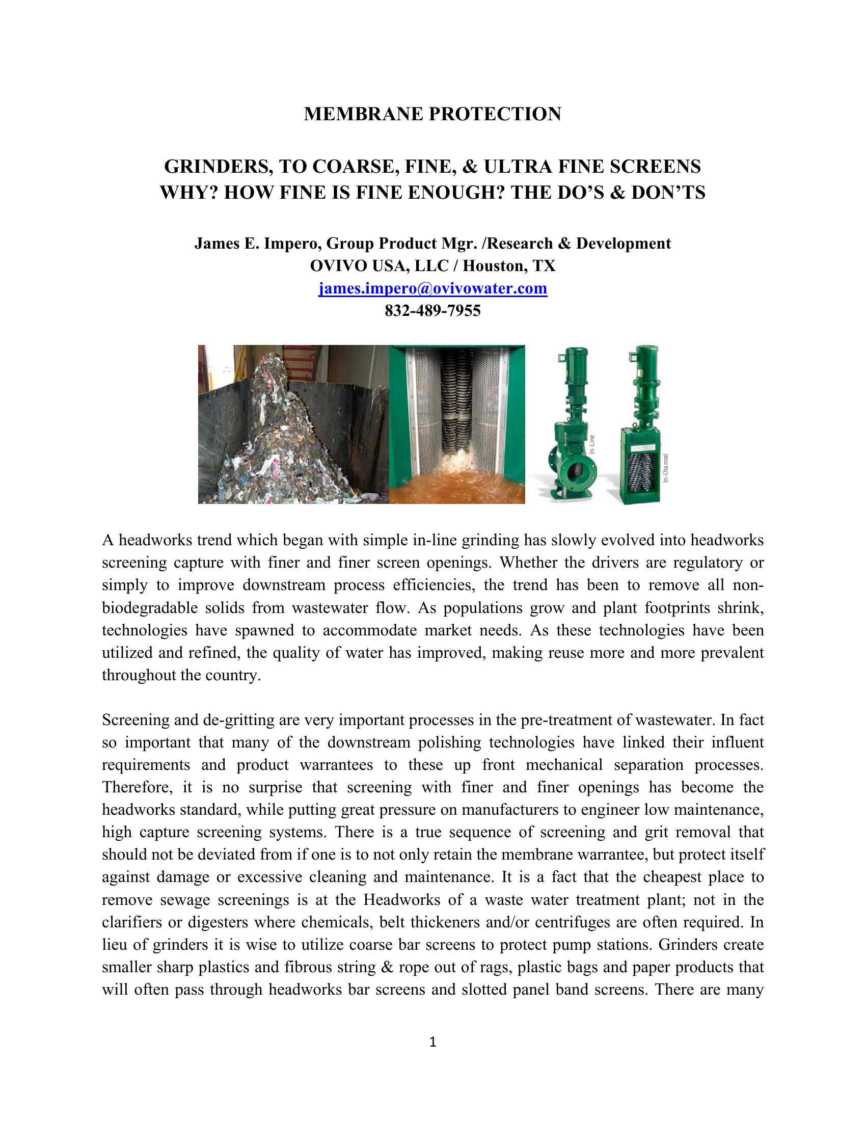 Membrane Protection: Grinders, to Coarse, Fine, & Ultra Fine Screens Why? How Fine is Fine Enough? The Do’s & Don?ts