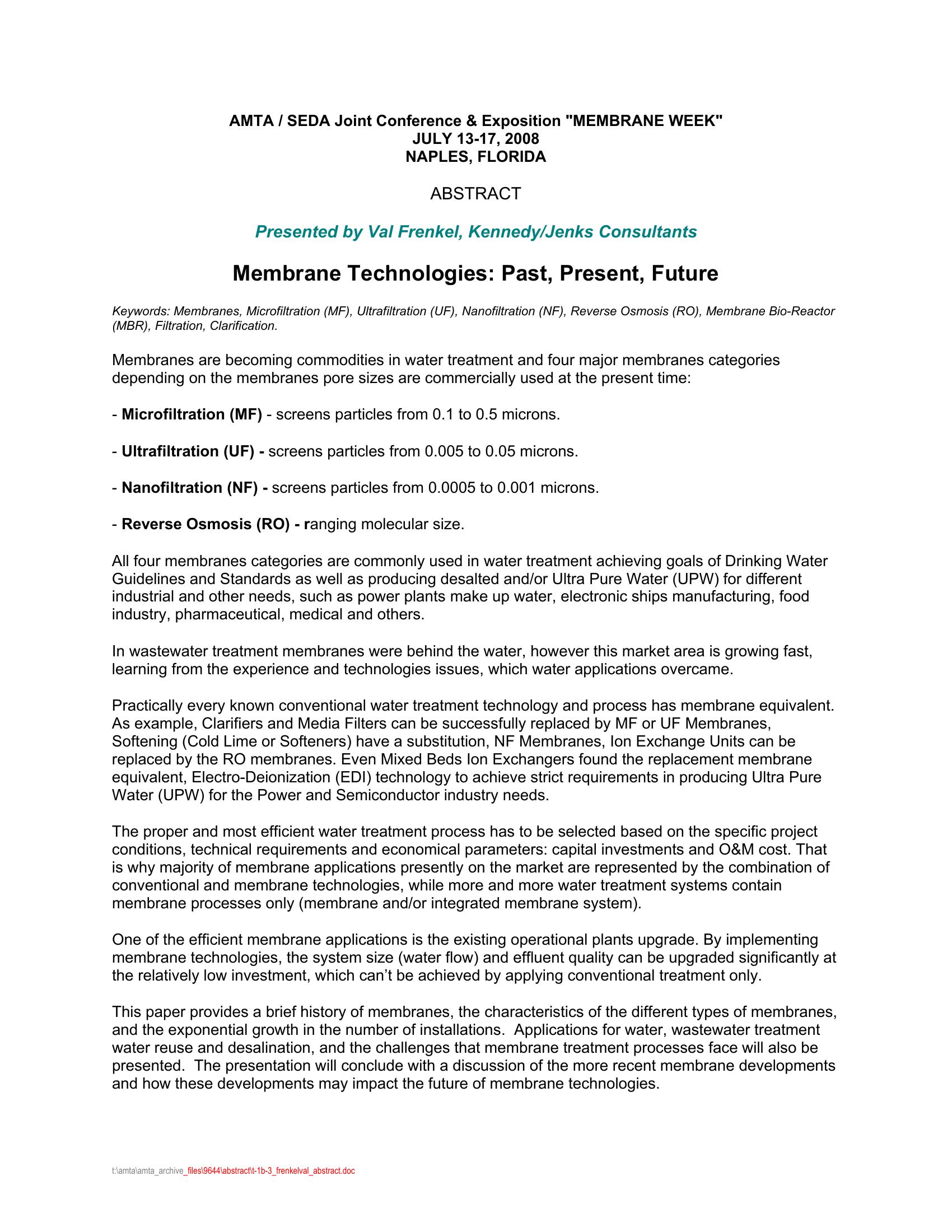 | Keywords | Membranes, Microfiltration (MF), Reverse Osmosis (RO), Membrane Bio-Reactor (MBR), Filtration, Clarification |