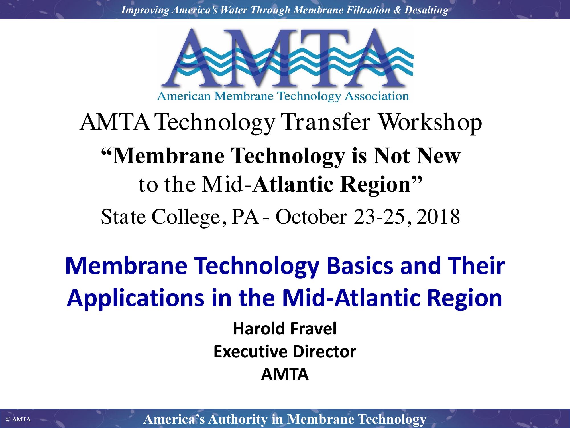There will be a short refresher on the basics of the variety of membrane processes and key issues around their use. A review of the membrane plants and usage in the Mid-Atlantic area will be given.