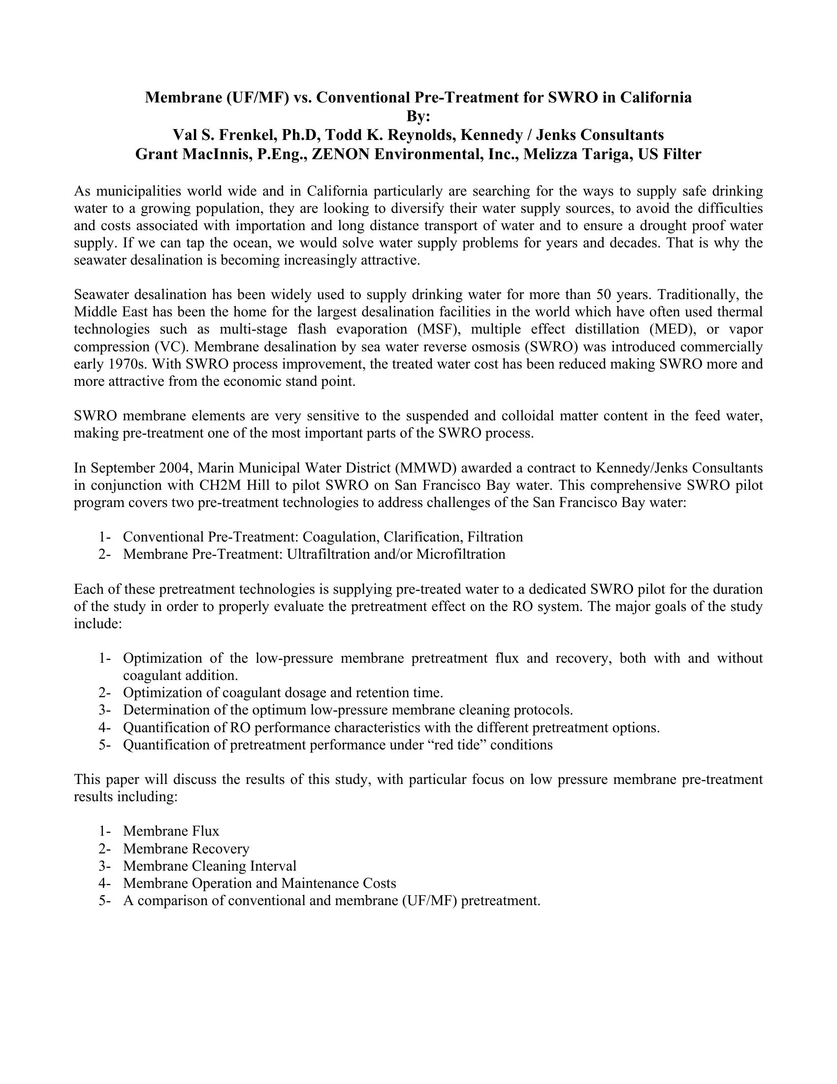 Membrane (UF/MF) vs. Conventional Pre-Treatment for SWRO in California