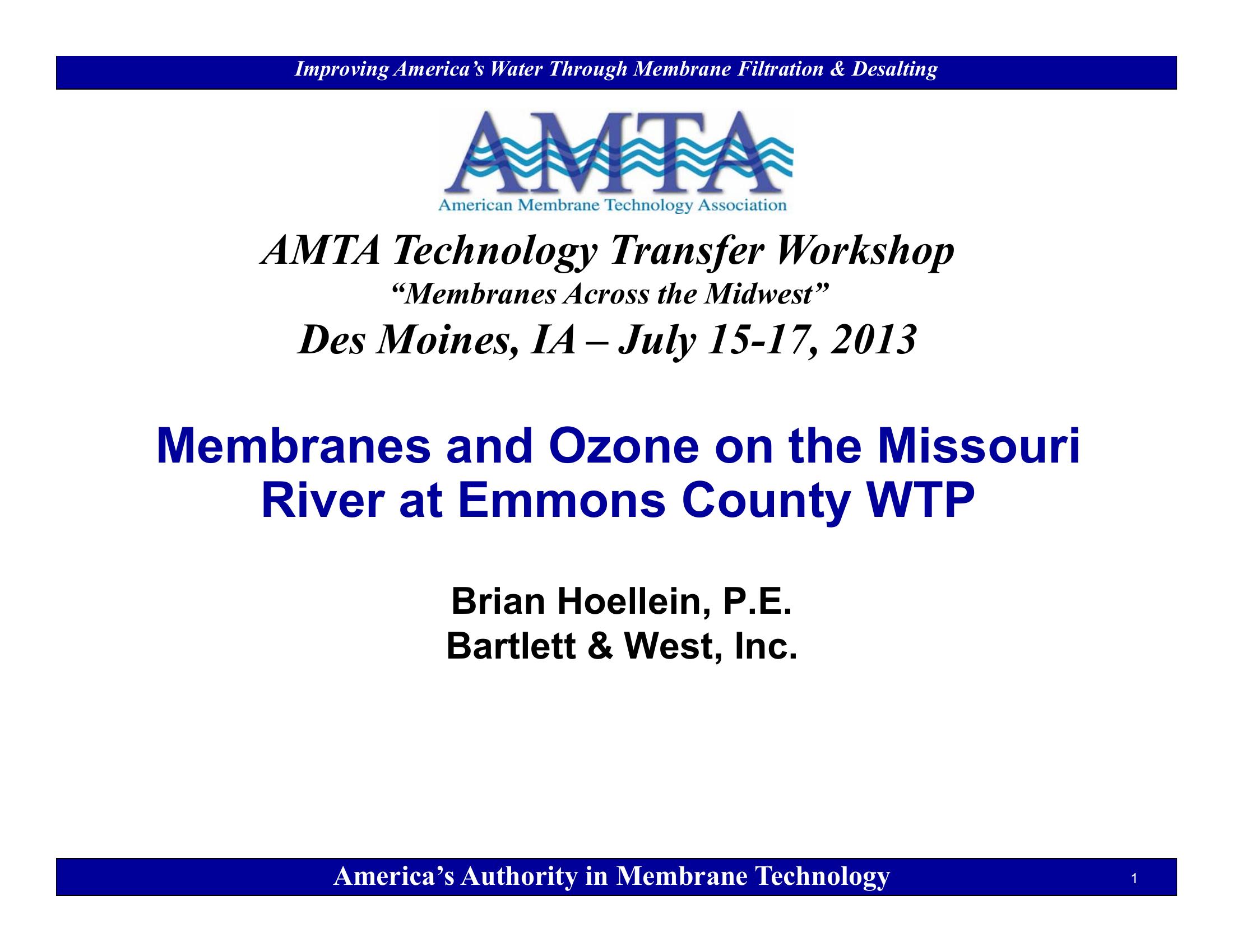This PowerPoint discusses ultrafiltration and reverse osmosis membranes and Ozone on the Missouri River at Emmons County WTP