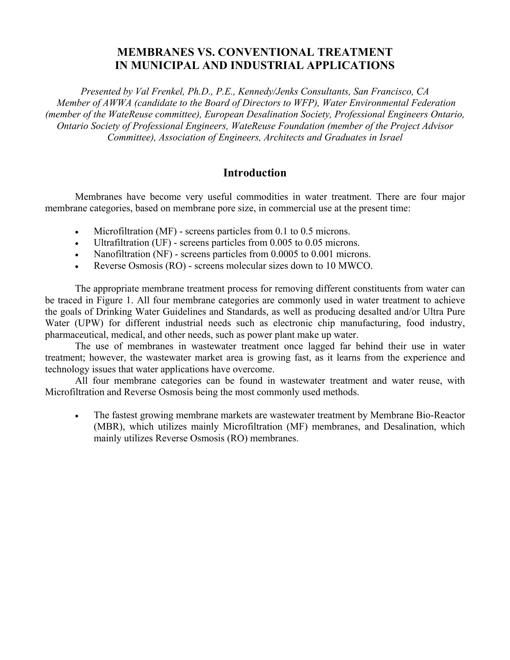 Membranes vs. Conventional Treatment in Municipal and Industrial Applications