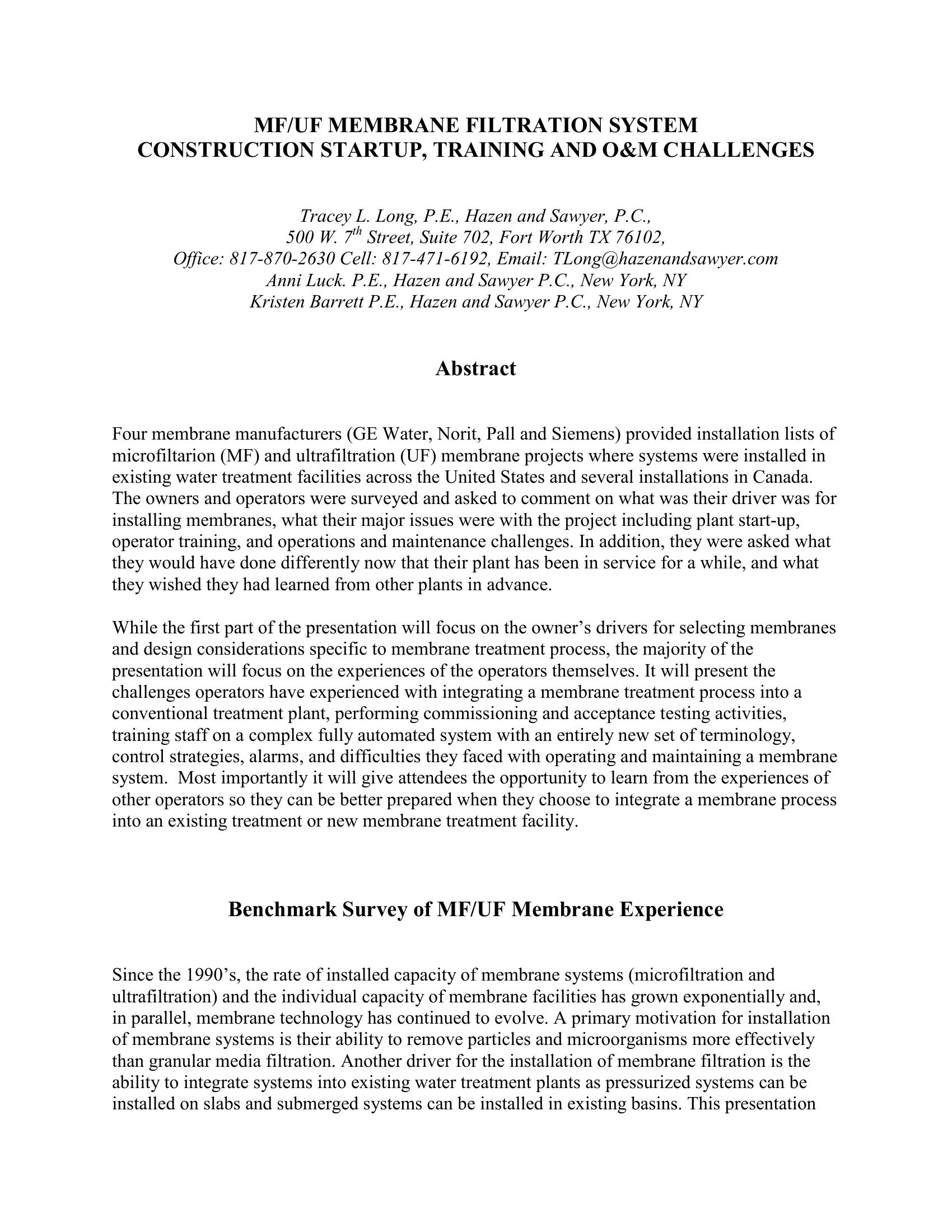 MF/UF Membrane Filtration System Construction Startup, Training and O&M Challenges