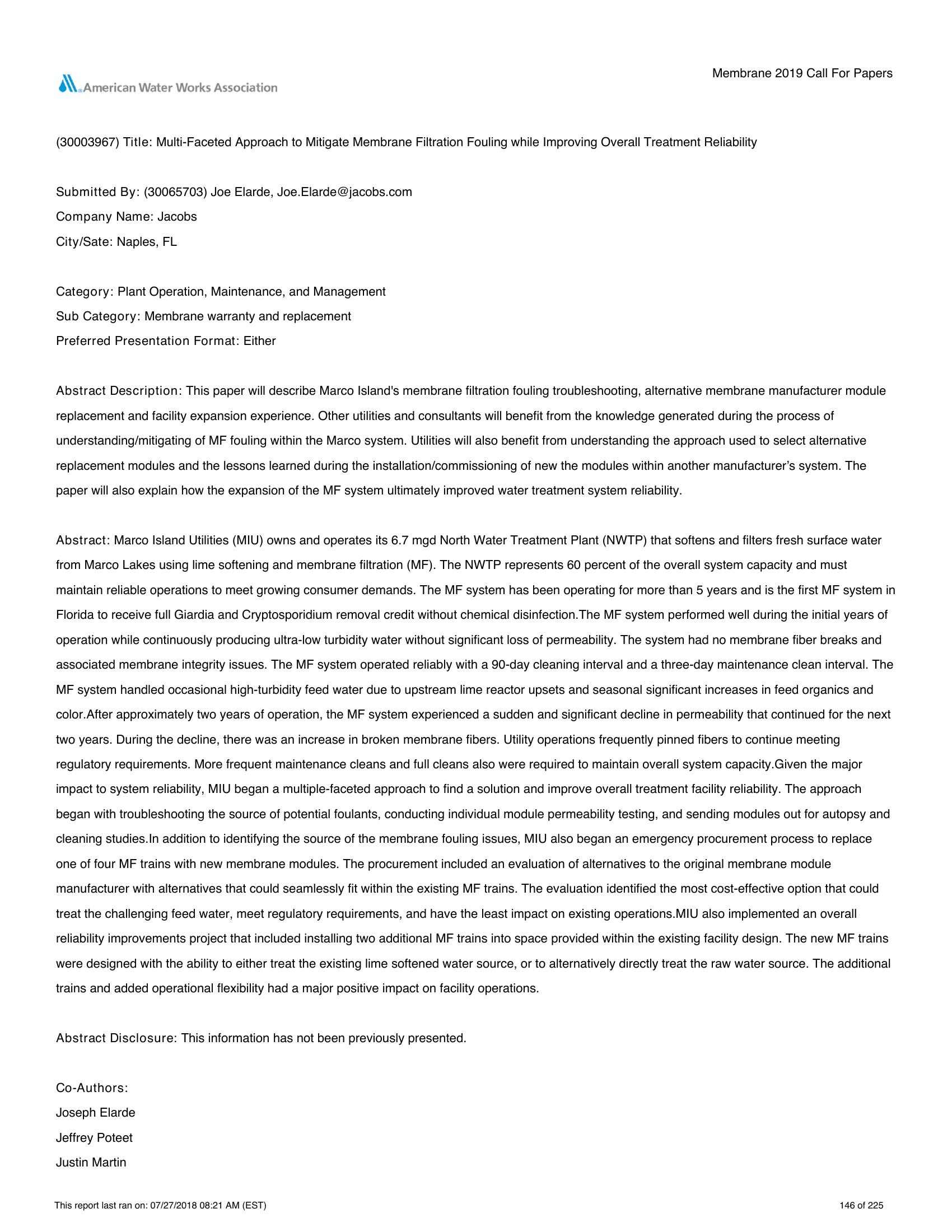 This paper will describe Marco Island’s membrane filtration fouling troubleshooting, alternative membrane manufacturer module replacement and facility expansion experience. Other utilities and consultants will benefit from the knowledge generated during the process of understanding/mitigating of MF fouling within the Marco system. Utilities will also benefit from understanding the approach used to select alternative replacement modules and the lessons learned during the installation/commissioning of new the modules within another manufacturer?s system. The paper will also explain how the expansion of the MF system ultimately improved water treatment system reliability.