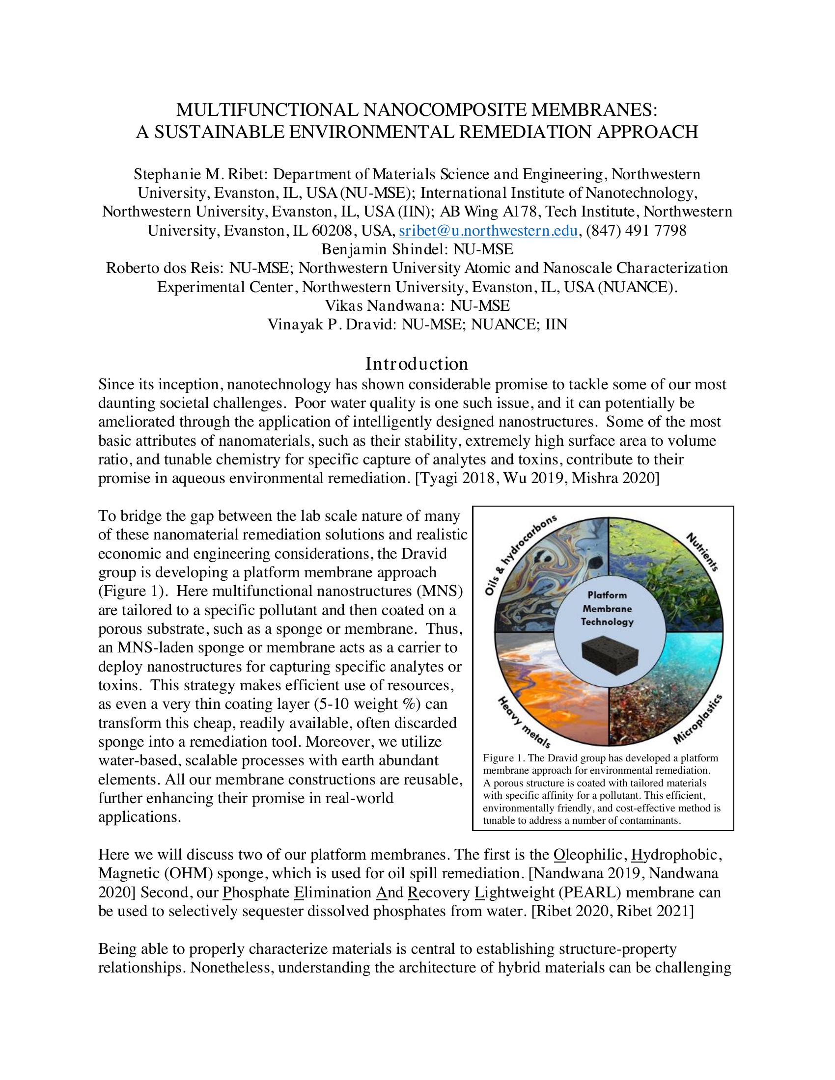 Since its inception, nanotechnology has shown considerable promise to tackle some of our most daunting societal challenges. Poor water quality is one such issue, and it can potentially be ameliorated through the application of intelligently designed nanostructures. Some of the most basic attributes of nanomaterials, such as their stability, extremely high surface area to volume ratio, and tunable chemistry for specific capture of analytes and toxins, contribute to their promise in aqueous environmental remediation. [Tyagi 2018, Wu 2019, Mishra 2020] To bridge the gap between the lab scale nature of many of these nanomaterial remediation solutions and realistic economic and engineering considerations, the Dravid group is developing a platform membrane approach (Figure 1). Here multifunctional nanostructures (MNS) are tailored to a specific pollutant and then coated on a porous substrate, such as a sponge or membrane. Thus, an MNS-laden sponge or membrane acts as a carrier to deploy nanostructures for capturing specific analytes or toxins. This strategy makes efficient use of resources, as even a very thin coating layer (5-10 weight %) can transform this cheap, readily available, often discarded sponge into a remediation tool. Moreover, we utilize water-based, scalable processes with earth abundant elements. All our membrane constructions are reusable, further enhancing their promise in real-world applications.