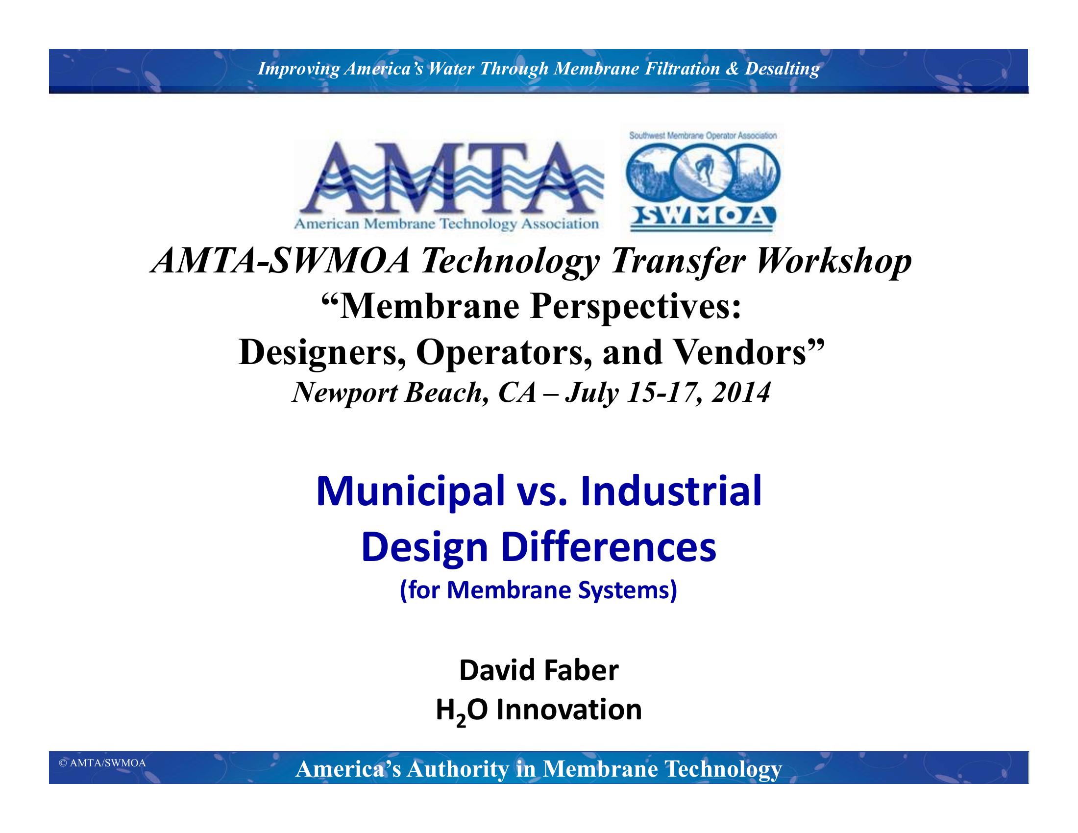 This presentation documents differences between municipal and industrial treatment projects with respect to membrane filtration (microfiltration and ultrafiltration) and membrane desalting (nanofiltration and reverse osmosis) processes. The presentation also provides example applications for membranes within various industrial markets. Industries that commonly utilize membrane processes include the oil and gas, semiconductor, paint, and dairy industries. .