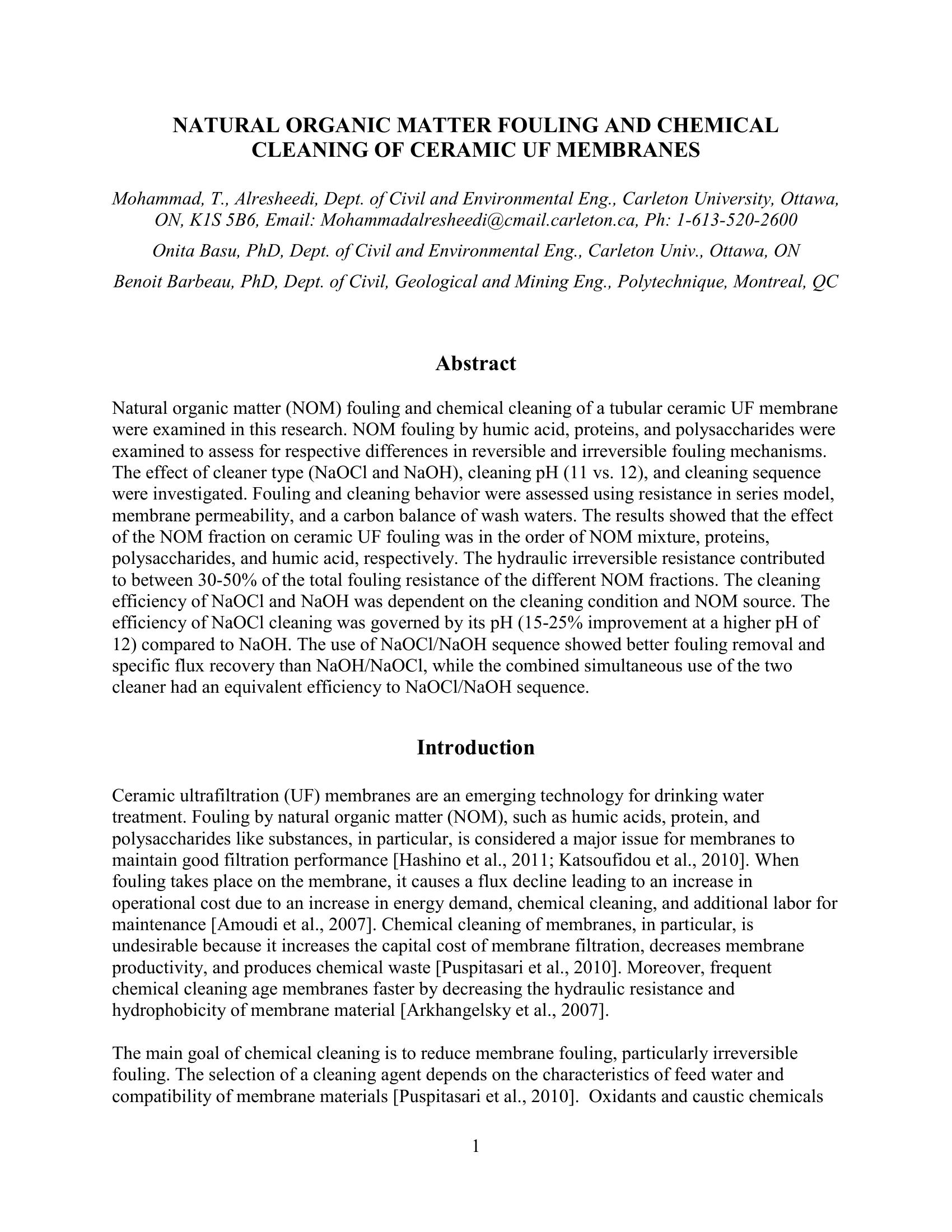 | Keywords | NOM Fouling, Ceramic UF Membranes, Cleaning |