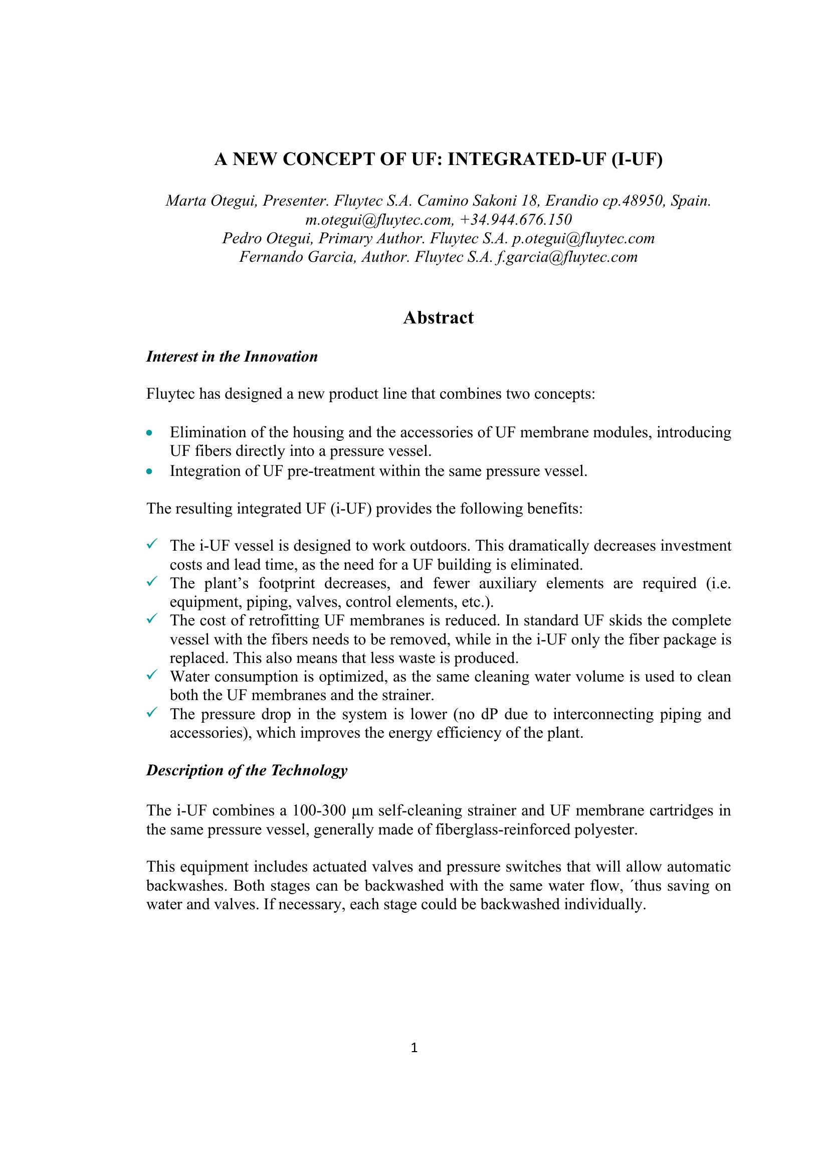 Interest in the Innovation Fluytec has designed a new product line that combines two concepts: Elimination of the housing and the accessories of UF membrane modules, introducing UF fibers directly into a pressure vessel. Integration of UF pre-treatment within the same pressure vessel.