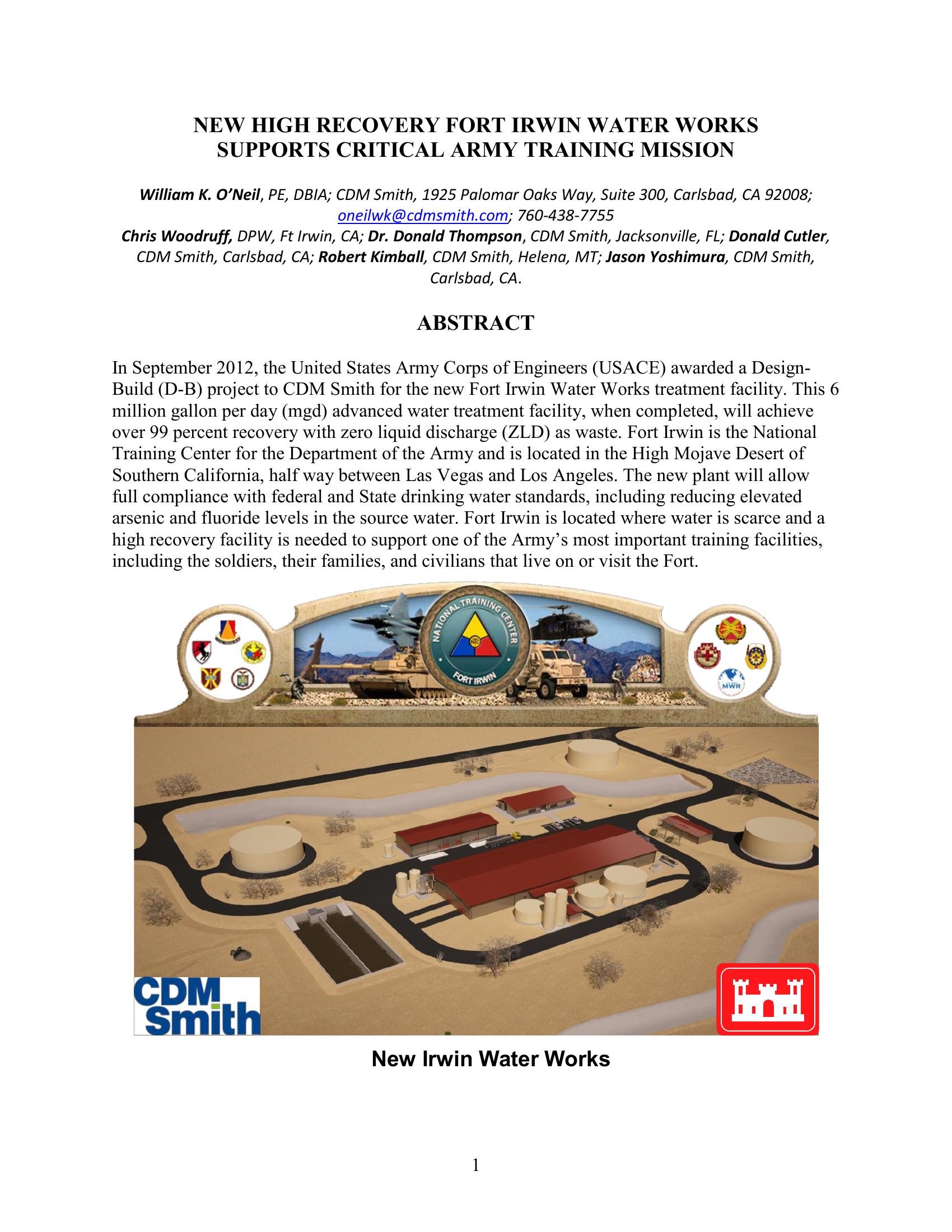 A 2007 pilot study by CH2M Hill identified electrodialysis reversal (EDR) as the preferred main treatment process to reduce source water contaminants to below drinking water standards. EDR was preferred over RO due to high silica levels in the source groundwater, and over an activated alumina process. The pilot study concluded the EDR teesting demonstrated the ability of the process to reduce fluoride and arsenic levels to below CA MCLs and Fort Irwin drinking water quality goals as well as providing a robust technique for treating groundwater from their basins either individually or as blends from the basins. The preferred EDR brine waste stream treatment system was identified to consist of partial lime clarification, granular media filtration, two stage RO, and vertical-tube falling film mechanical evaporation.