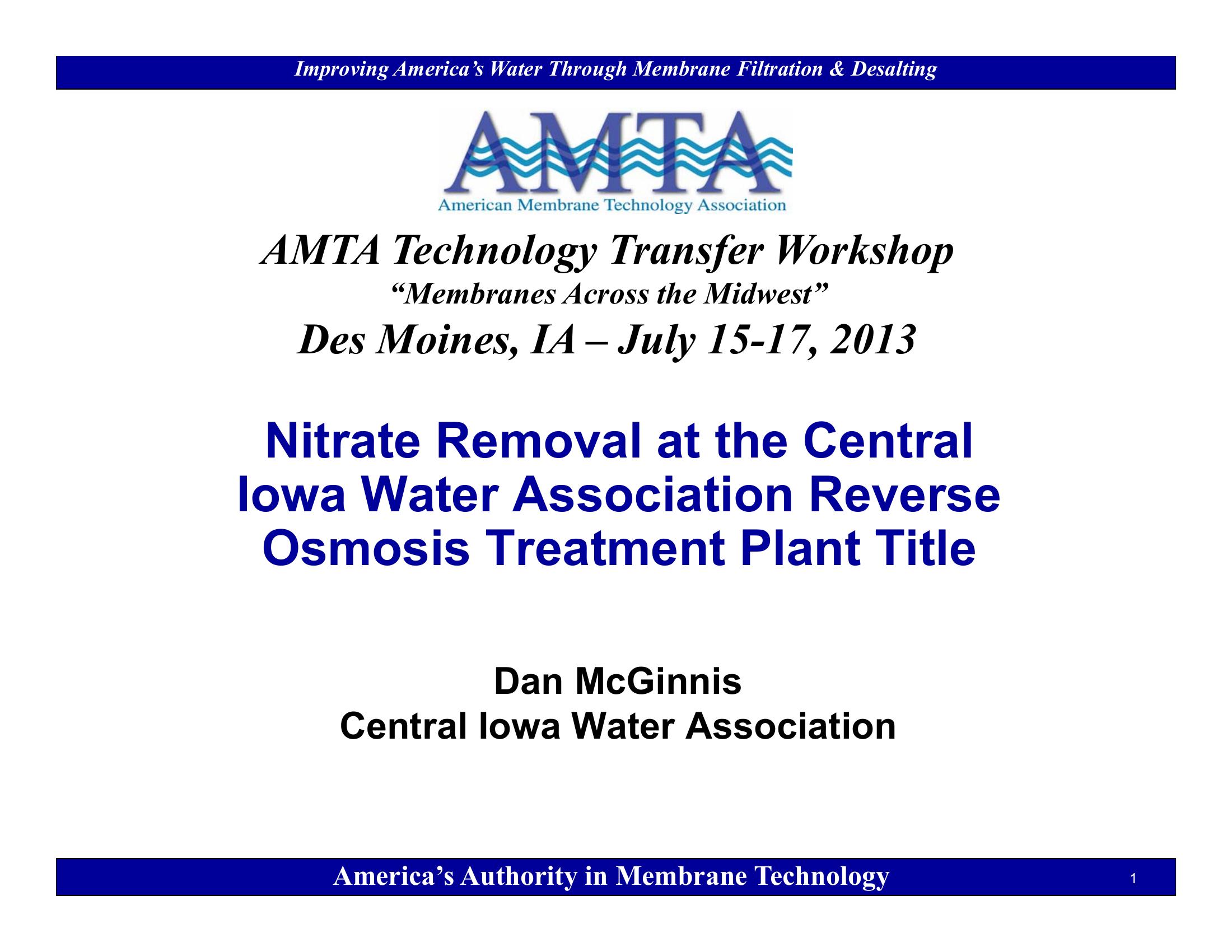 This PowerPoint discusses Nitrate removal at the Central Iowa Water Association Reverse Osmosis Treatment Plant